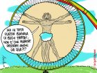 Nelle foto d’archivio, la rotatoria con il telo sfregiato dai vandali e senza l’Uomo Vitruviano. Oltre ad una vignetta satirica del luglio scorso del nostro Alessio Atrei.