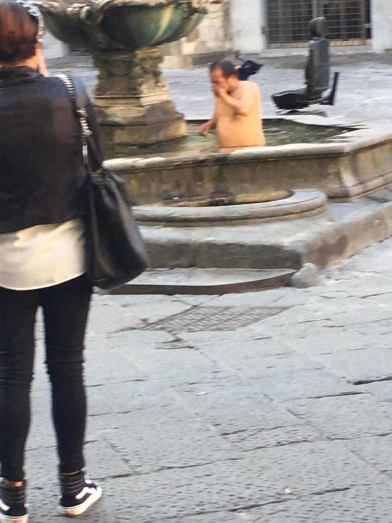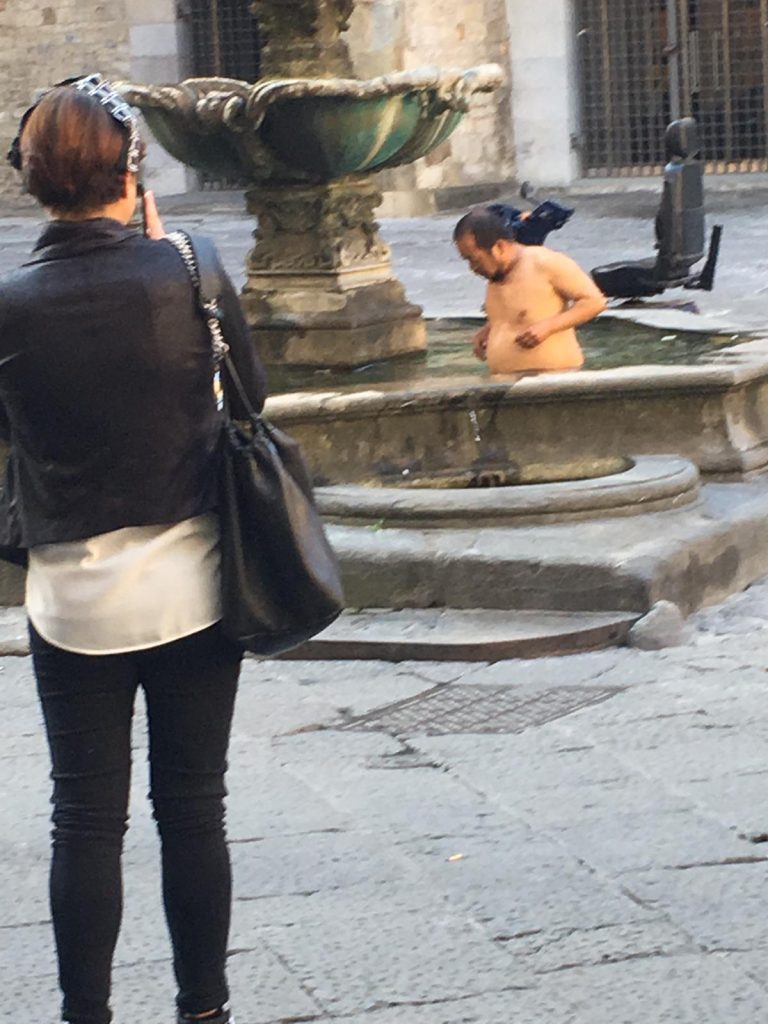 E’ tornato da alcune settimane in città e la sua presenza non passa certo inosservata. Dopo un periodo trascorso a Roma, Hu Li Xia, il clochard cinese conosciuto come «Godenzio», ha fatto rientro a Prato. L’uomo, affetto da evidenti fragilità mentali, vive in strada e (come documentano questi scatti) ha approfittato della vasca della fontana del Bacchino, in piazza del Comune, per lavarsi. Hu, incurante dei passanti, si è completamente denudato e si è tuffato nella fontana lavandosi il corpo e gli abiti. Necessario l’intervento della polizia per far rivestire Godenzio e allontanarlo, vista la presenza anche di donne e bambini. La sua storia, fatta di disagio e marginalità, aveva fatto scattare anni fa una gara di solidarietà a Prato tra commercianti e residenti del centro, pronti a dargli una mano.