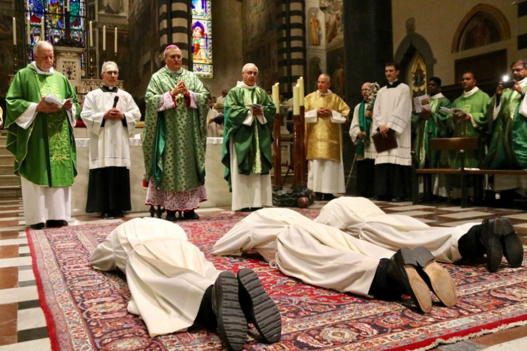 «Essere diaconi significa servire. La Chiesa non è privilegio ma servizio. Siate segno della presenza di Dio e sacramento della sua misericordia». Lo ha ricordato il vescovo Franco Agostinelli ai tre nuovi diaconi della diocesi di Prato ordinati ieri pomeriggio in cattedrale all’interno di una solenne concelebrazione molto partecipata. Ponendo le mani sul loro capo, consegnando il Vangelo e la stola, il Presule ha ordinato Silvano Pagliarin, Reji Thomas Vechoor e Alberto Giuseppe Pintus. Sono tre seminaristi della comunità di Prato in cammino verso il sacerdozio. Quella del diaconato rappresenta l’ultima tappa prima di diventare preti.