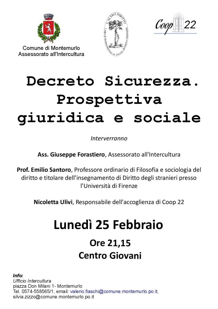 L’assessorato all’intercultura del Comune di Montemurlo promuove per stasera lunedì 25 febbraio ore 21,15 al Centro Giovani (piazza Don Milani – Montemurlo) un incontro dal titolo “Decreto sicurezza. Prospettiva giuridica e sociale”. Interverranno Emilio Santoro, professore ordinario di filosofia e sociologia del diritto e titolare dell’insegnamento di diritto degli stranieri all’Università di Firenze, Nicoletta Ulivi, responsabile dell’accoglienza di Coop 22 e l’assessore all’intercultura del Comune di Montemurlo, Giuseppe Forastiero che spiega:« L’iniziativa si propone di informare con precisione e chiarezza sulle ricadute giuridiche e sociali che il Decreto sicurezza avrà sul territorio, in particolar modo in riferimento alla questione dei migranti. Vogliamo che questa serata sia un momento di approfondimento e un’opportunità di confronto con esperti del settore, il professor Santoro che insegna diritto degli stranieri all’Università di Firenze e Nicoletta Ulivi, responsabile della Coop 22, che gestisce il Cas di Montemurlo». Ingresso libero. Per maggiori informazioni si può chiamare la biblioteca “Bartolomeo Della Fonte” (piazza Don Milani, 1 – Montemurlo) telefono 0574-558565 o scrivere a valerio.fiaschi@comune.montemurlo.po.it