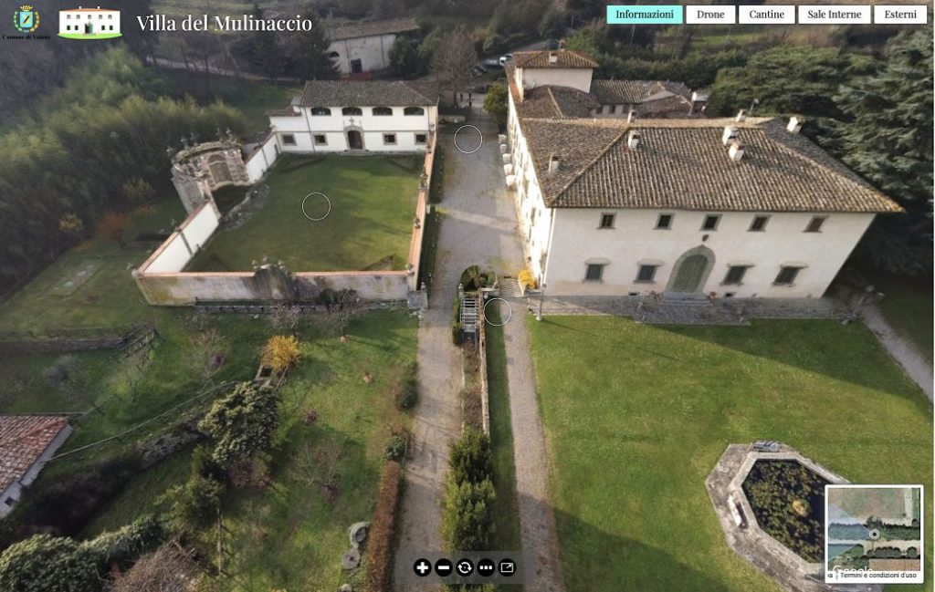 Il tour si avvale di una quarantina di foto panoramiche degli ambienti e del parco completati da menù utilizzabili con varie modalità, che permettono di spostarsi da un ambiente all’altro simulando una visita reale. Oltre alle panoramiche dal drone si possono visitare le cantine e la legnaia, le sale al piano nobile e il cucinone, il Ninfeo, il boschetto e il giardino antistante la villa con la fontana. Lo strumento, che sarà accessibile da domani, giovedì 21 gennaio, sul sito del Comune di Vaiano, è implementabile con testi informativi e ulteriori immagini e video. Le immagini sono state caricate anche su Google street wiew e sono quindi accessibili anche da Google Maps. Cavaciocchi e la sua azienda stanno lavorando a un tour simile anche per il Museo della Badia di Vaiano – Casa di Agnolo Firenzuola, che dovrebbe essere pronto a febbraio.