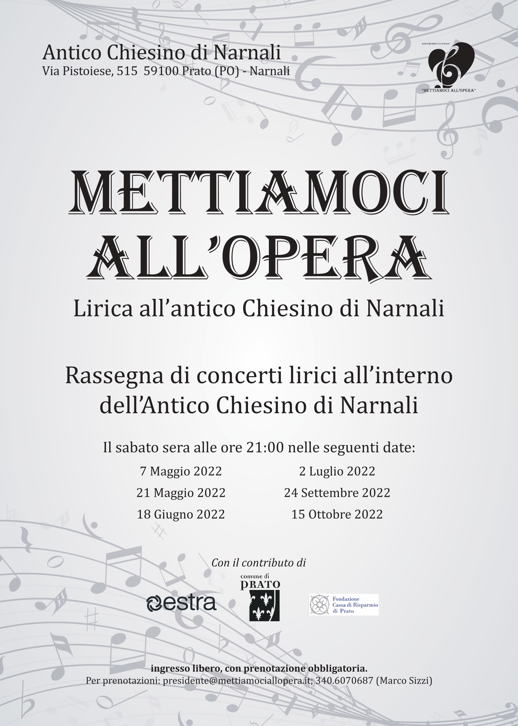 Sabato 7 maggio partirà la rassegna di concerti lirici all’interno del chiesino di Narnali, organizzata dall’associazione culturale Mettiamoci all’opera che, lo scorso 10 aprile, festeggiò 10 anni di attività con una speciale esibizione al teatro Metastasio.