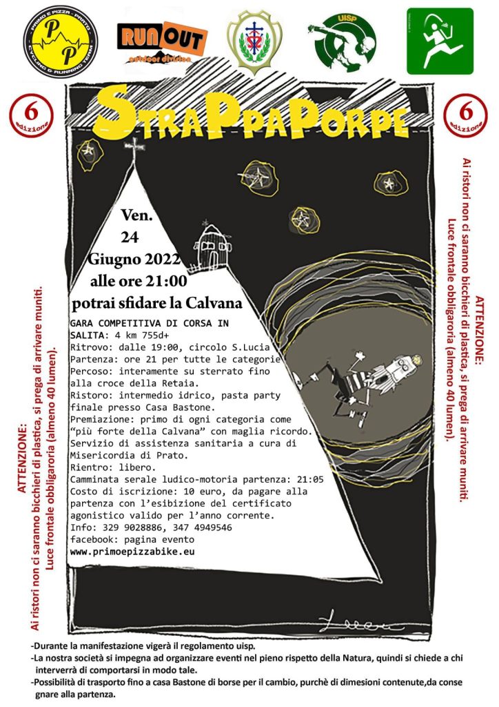 Dopo due anni di pandemia e soprattutto dopo il grande successo delle prime cinque edizioni, a grande richiesta torna venerdì 24 giugno la 6° edizione della spettacolare gara podistica in notturna “STRAPPAPORPE”. Si tratta di un altro originale appuntamento organizzato da una delle società ciclistiche e podistiche pratesi più attive, la “Primo e Pizza Bike”, che porterà i partecipanti ad affrontare a piedi la dura salita che da Santa Lucia porta alla Croce della Retaia.