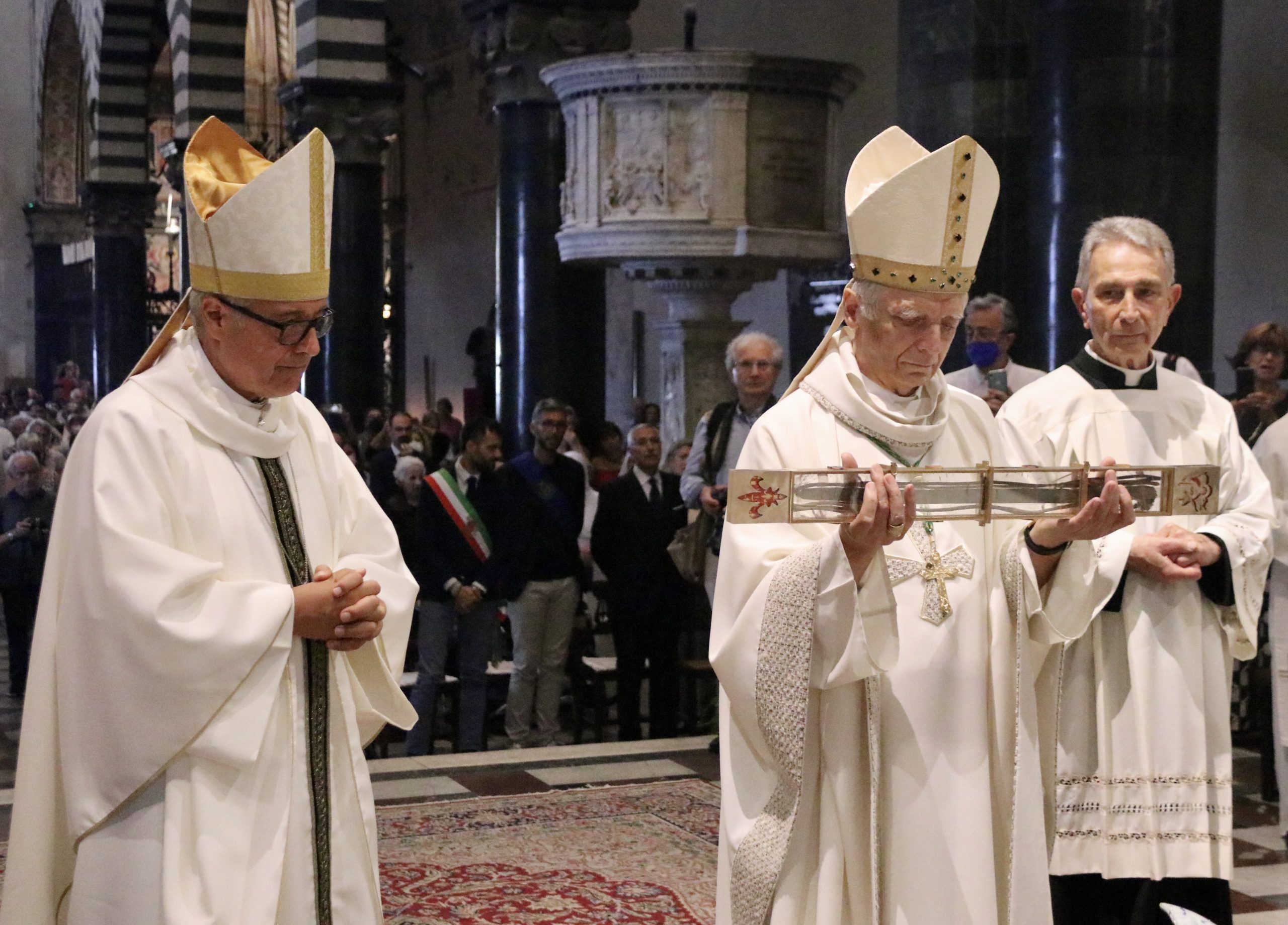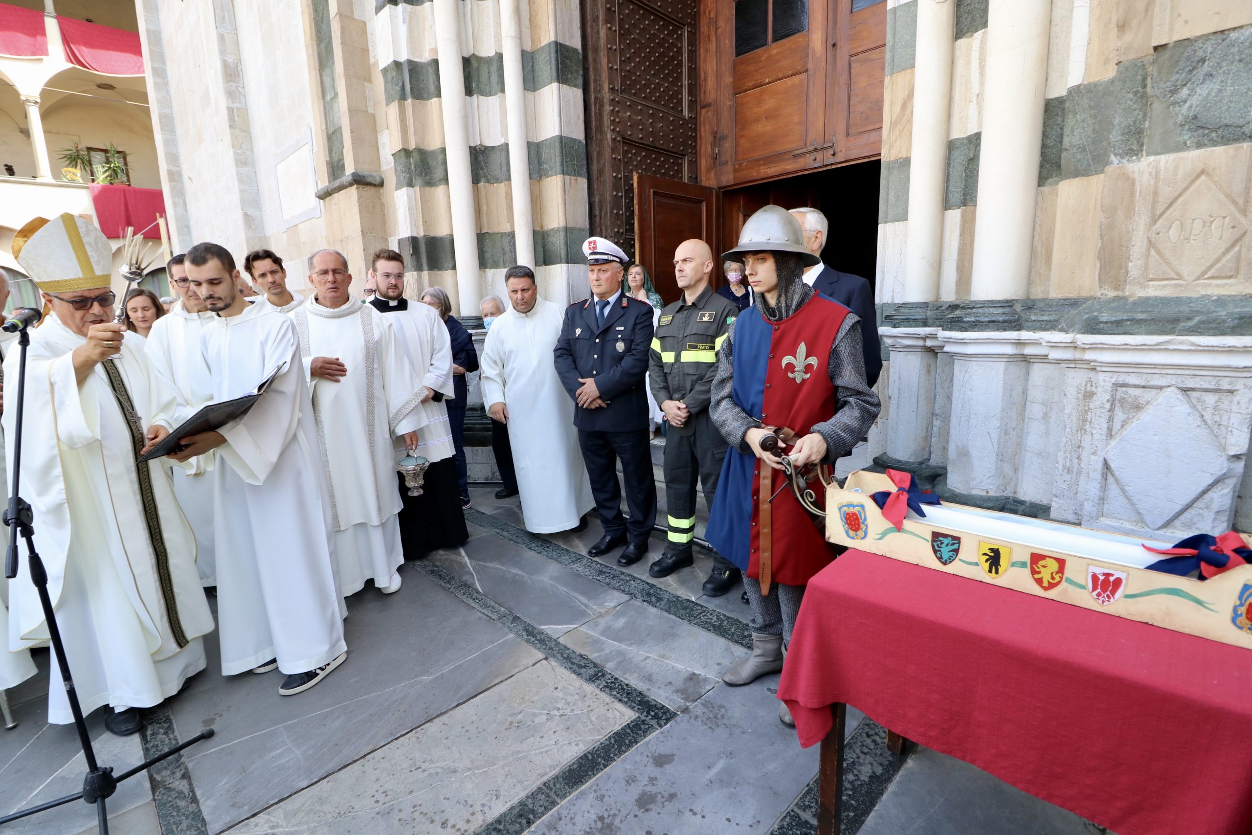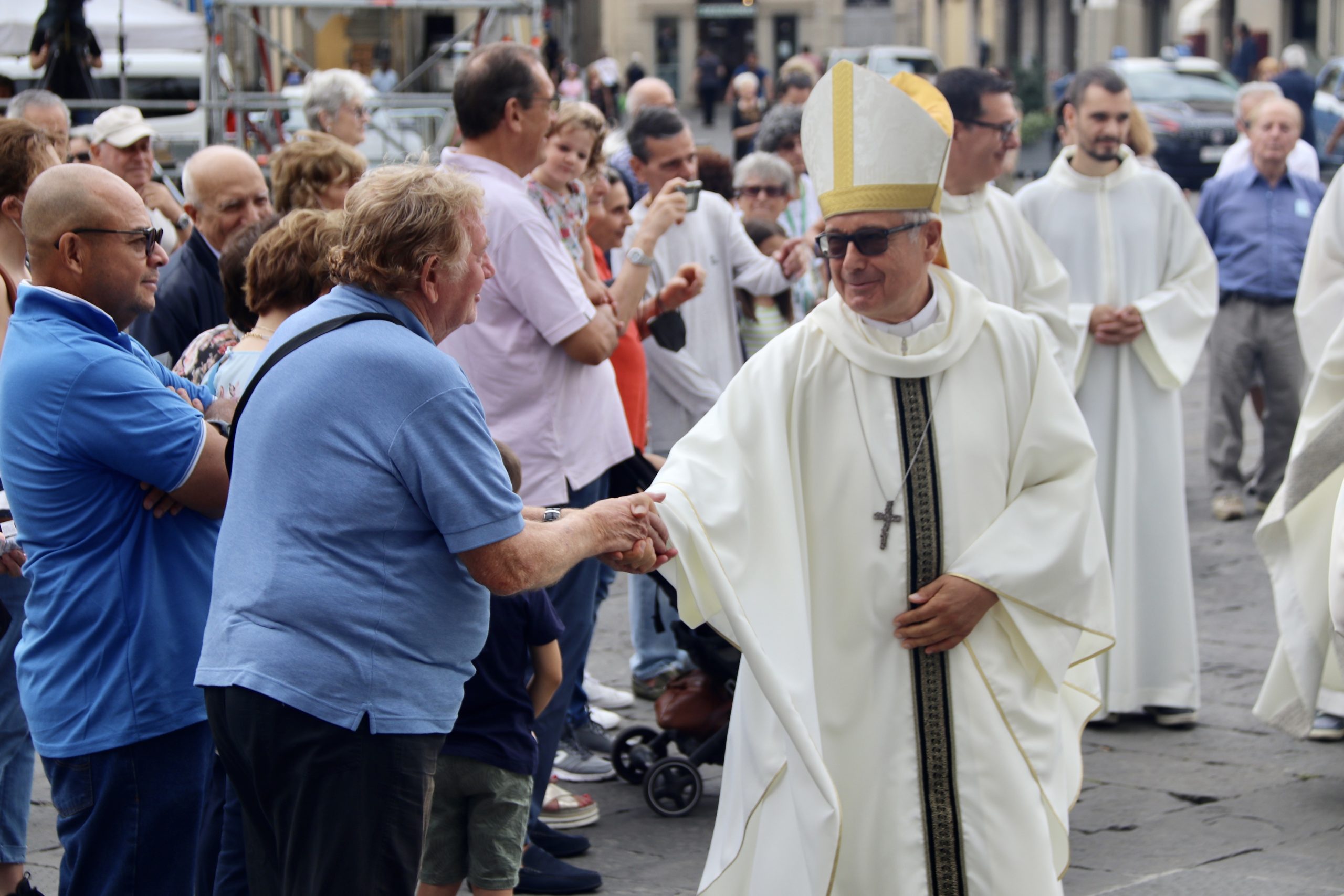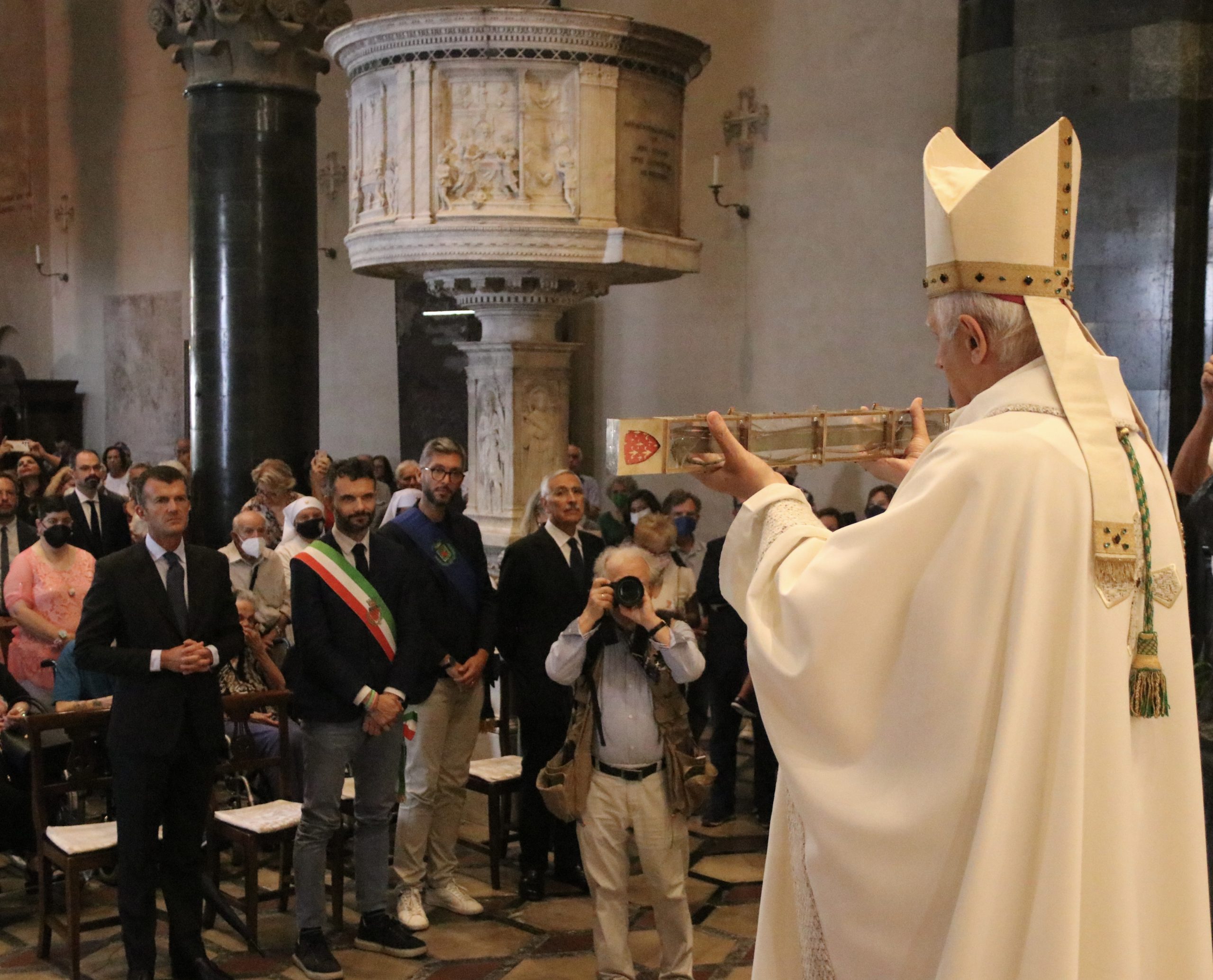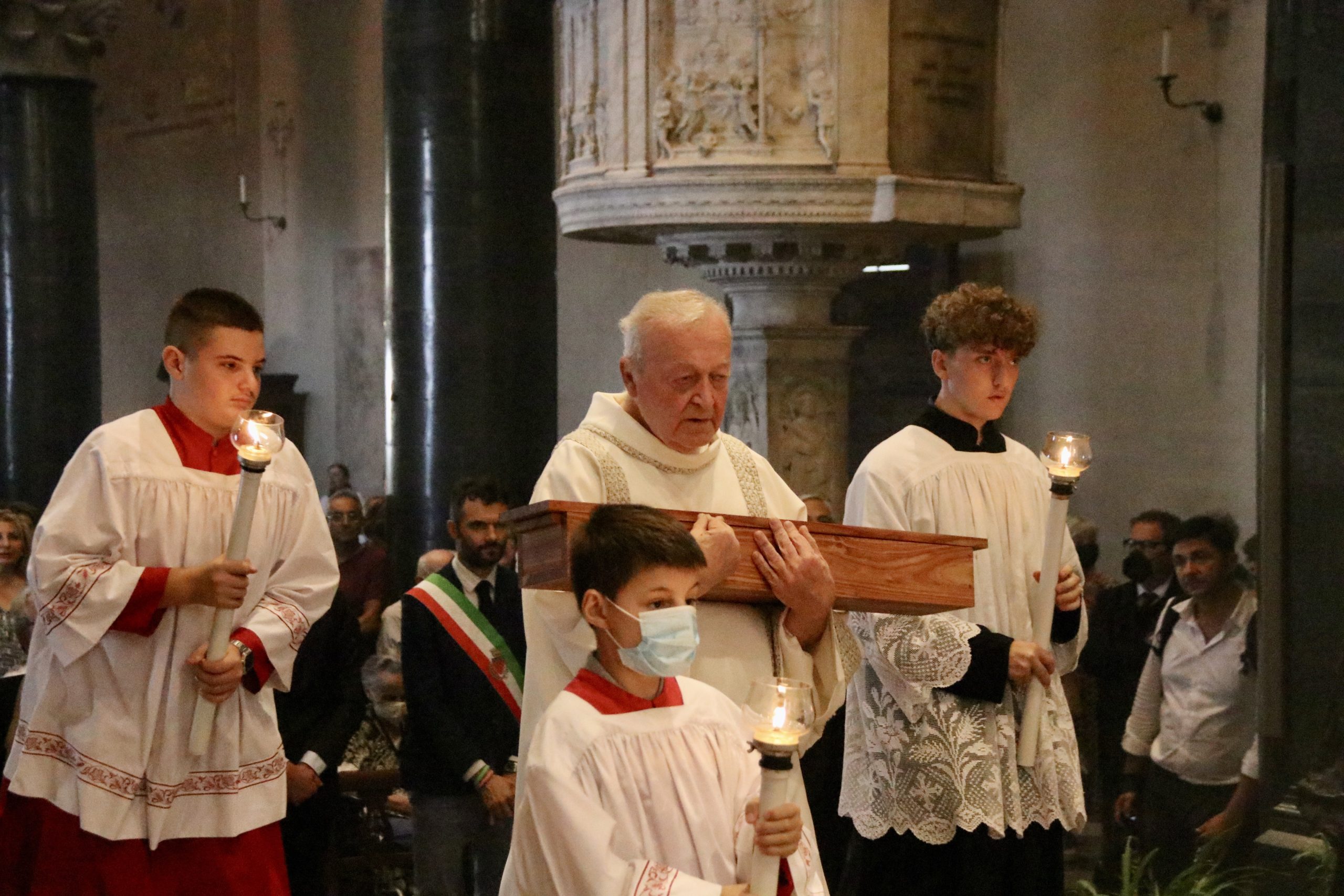 Al termine della celebrazione si è svolto un altro tradizionale e importante momento: l’offerta dei ceri per la Cappella del Sacro Cingolo donati alla Diocesi dall’Amministrazione comunale. Il rito si è svolto sul sagrato della cattedrale. In questa occasione il sindaco Matteo Biffoni ha rinnovato la disponibilità e l’impegno del Comune a camminare a fianco alla Chiesa pratese per il bene della città. Biffoni ha ricordato quando il 19 marzo 2020, in piena emergenza sanitaria, si tenne l’ostensione straordinaria del Sacro Cingolo per invocare la protezione sulla città. «In quel momento si è rinnovato un percorso: la parte laica e la parte religiosa della città si è presa cura di una comunità – ha detto il Sindaco –. Mentre i sanitari si prendevano si occupavano della malattia, le istituzioni si sono prese cura di una comunità smarrita e impaurita. Oggi che nubi di tensioni sociale e difficoltà economiche sembrano avvicinarsi, ci sarà ancora bisogno di questo connubio di essere fianco a fianco nel prendersi cura di una comunità che inizia a dare segnali di inquietudine e paura per il futuro. Insieme questa città sa affrontare tutte le sfide che il destino ci vorrà lanciare».