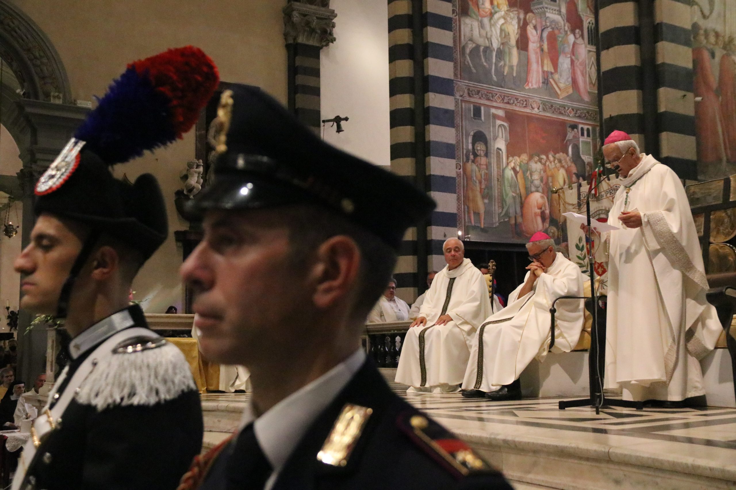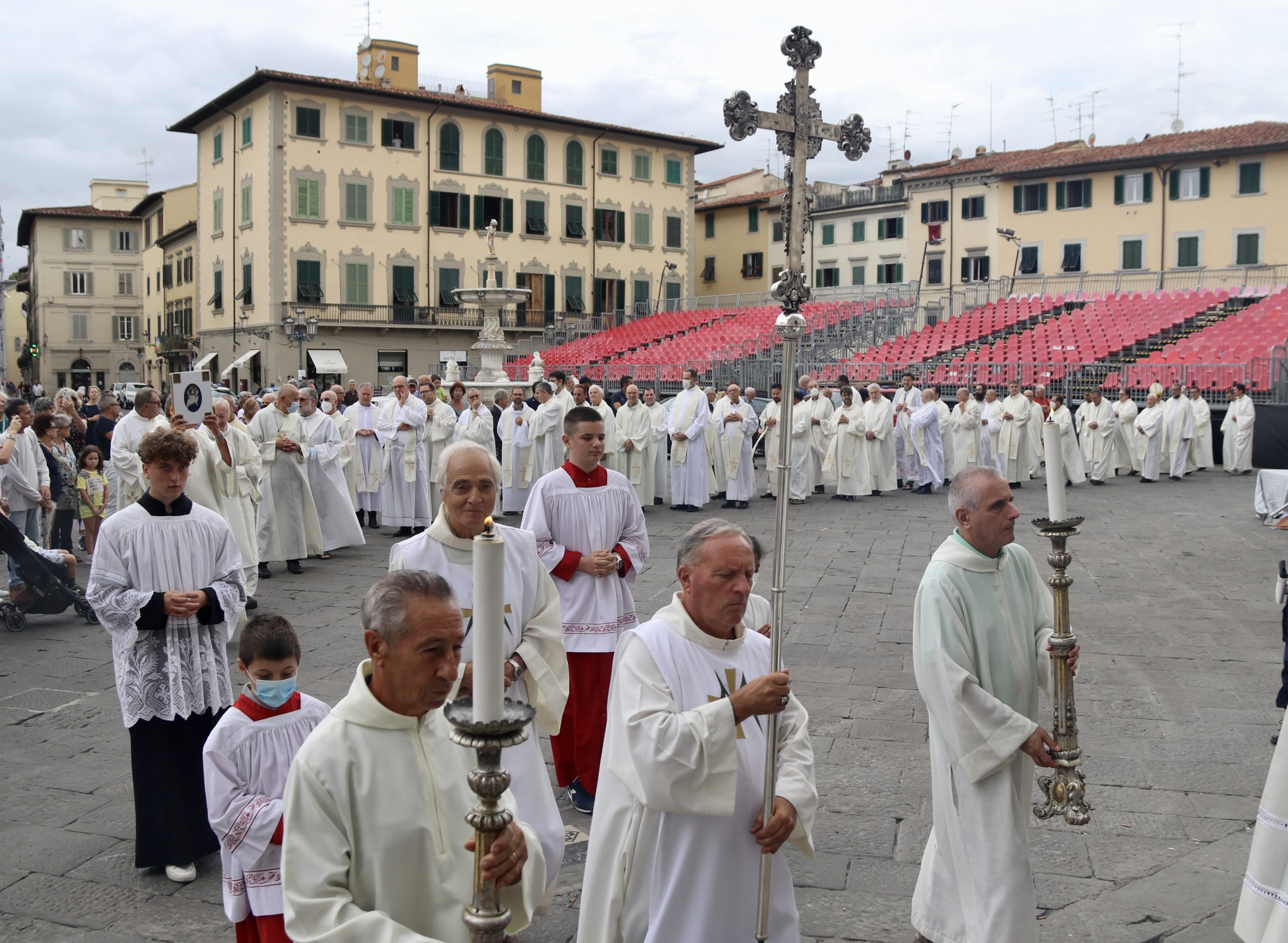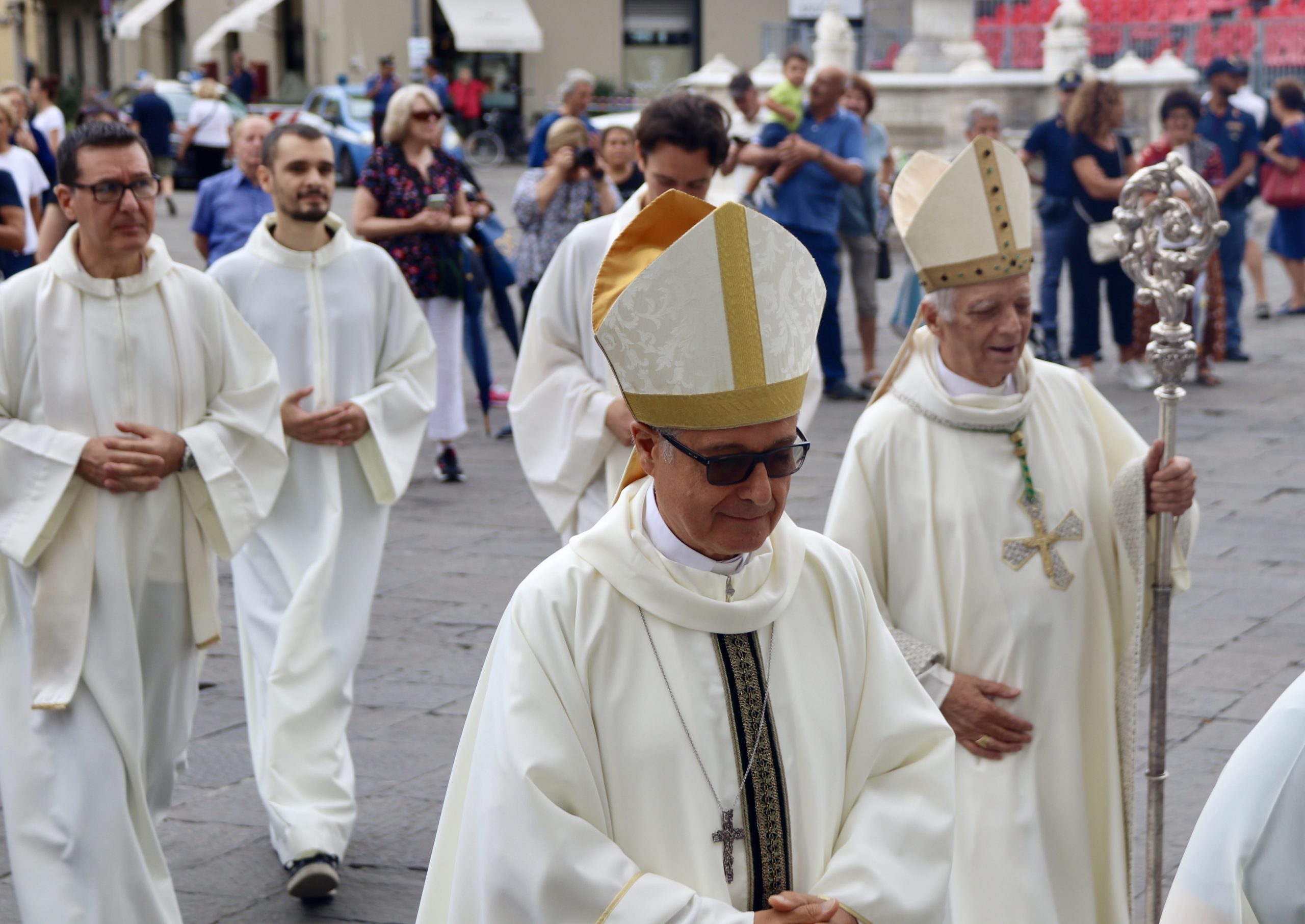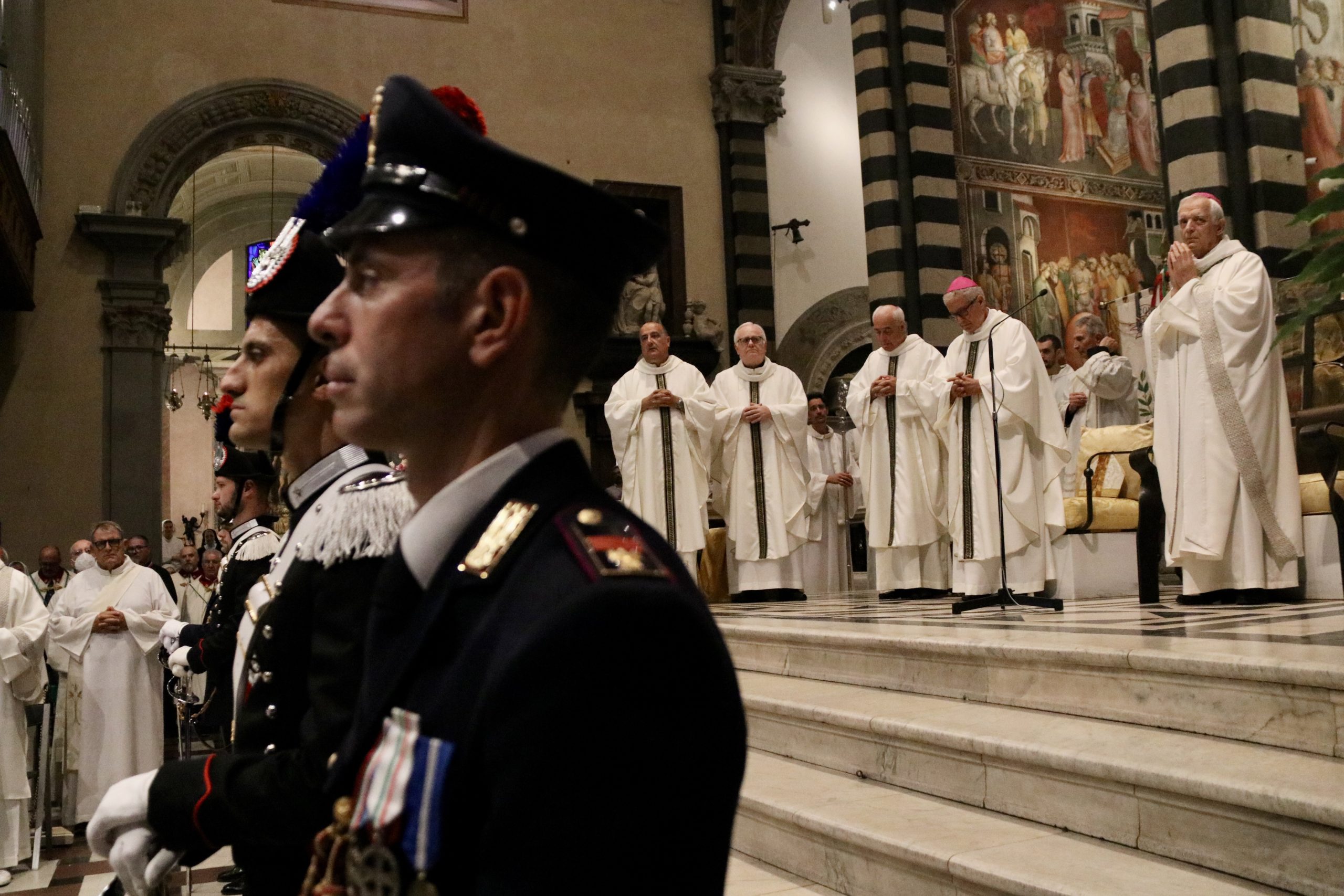 Nelle prime file erano presenti le istituzioni cittadine con il sindaco Matteo Biffoni, il presidente della Provincia Francesco Puggelli, il prefetto Adriana Cogode, il questore Giuseppe Cannizzaro e i rappresentanti delle forze dell’ordine. La celebrazione è stata animata dalla Cappella musicale della Cattedrale e dalla Corale San Francesco.