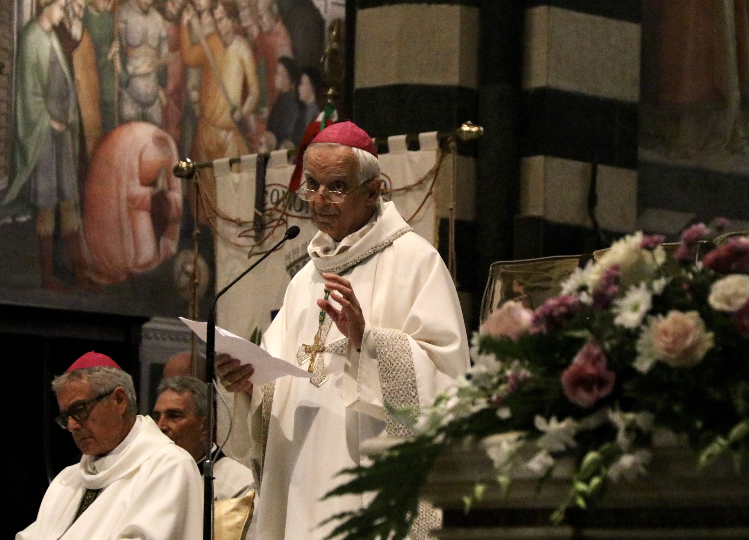 Nell’omelia, incentrata sulla antica devozione pratese nei confronti della cintura appartenuta a Maria, monsignor Meini ha sottolineato come la reliquia sia da sempre segno di speranza. «Tenerissima è la tradizione della cintura lasciata al ritardatario Tommaso (l’apostolo che secondo la tradizione ha ricevuto la reliquia in dono NdR): non manchi a nessuno un legame a cui aggrappare la propria speranza! Guardando a Maria, noi oggi dobbiamo chiederci quel’è la vera che la comunità cristiana deve consegnare alle persone del nostro tempo». Poi un invito e un augurio alla comunità di Prato a custodire e a consegnare al nostro tempo la «cintola del Buon Governo che da un secolo all’altro ha sempre stretto nell’unità i cittadini e ha tramandato uno stile di operosità, di dialogo e di accoglienza. Una cultura che non alza i toni e non costruisce barriere, che non è mai contro nessuno e tesse ogni giorno la trama dei buoni rapporti con tutti. È stoffa delicata e robusta che consolida e riscalda ogni vincolo di unione, prodotto di marca della migliore cultura cristiana, griffata col filo d’oro della benedizione del Signore. Una cultura da custodire senza cedere alla lusinga della contraffazione e da considerare sempre come prezioso patrimonio pratese. Fatene umile, ma coraggiosa ostensione pubblica perché Prato, città dell’impegno multiforme, sia per tutti un segnale di speranza e di ripresa, esempio concreto che la “Politica” sana è possibile, che la solidarietà è feconda, che il bene comune è fruttuoso. Con questa cintura di speranza Prato sia valido punto di riferimento per le nuove generazioni e per tutti quelli che anche da lontano torneranno qui a trovare lavoro», ha affermato mons. Meini.