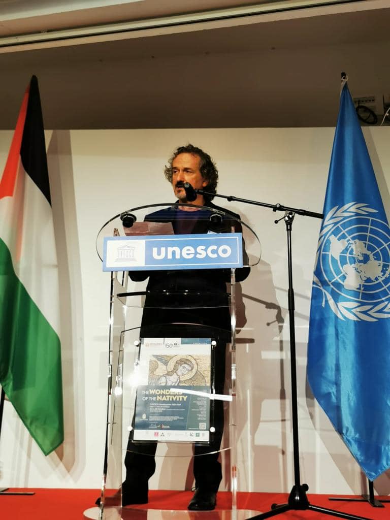 “Buonasera, grazie a tutti per l’invito di cui sono molto onorato. Rappresento la quarta generazione di una famiglia, i Piacenti, che opera dal 1875 nel campo del restauro e della conservazione. Dal 2013 la Piacenti ha la fortuna di vivere un’esperienza unica: il restauro della Basilica della Natività. Per un restauratore, un archeologo o un amante dell’arte è uno dei sogni più desiderati della vita. Conoscere le bellezze artistiche, monumentali e archeologiche di uno dei pilastri religiosi del mondo può cambiarti la vita. Noi della Piacenti sentiamo questa esperienza come una ricompensa inaspettata. La bellezza di vivere a Betlemme e a Gerusalemme, conoscere i greco-ortodossi e gli armeni e trovare i francescani nella culla del cristianesimo ci ha aiutato a riconoscere e comprendere le nostre origini. La ricerca scientifica e archeologica, il progetto e l’esecuzione dei lavori di conservazione sono il miglior regalo che la Terra Santa potesse offrire alla Piacenti. Grazie a tutti coloro che hanno condiviso con noi questa meravigliosa avventura professionale. Ringraziamo le tre Chiese, l’Autorità Palestinese e il Comitato Presidenziale. Un ringraziamento speciale va all’Ambasciata di Palestina presso la Santa Sede per l’aiuto e l’affetto dimostrato durante i lavori. Infine, grazie all’UNESCO per la fondamentale ammissione della Basilica a Patrimonio dell’Umanità, consentendo alla Palestina di mostrarla al mondo in tutto il suo splendore. Ci auguriamo che questa mostra apra il cuore dei visitatori alla bellezza del luogo in cui Dio ha toccato la terra”.