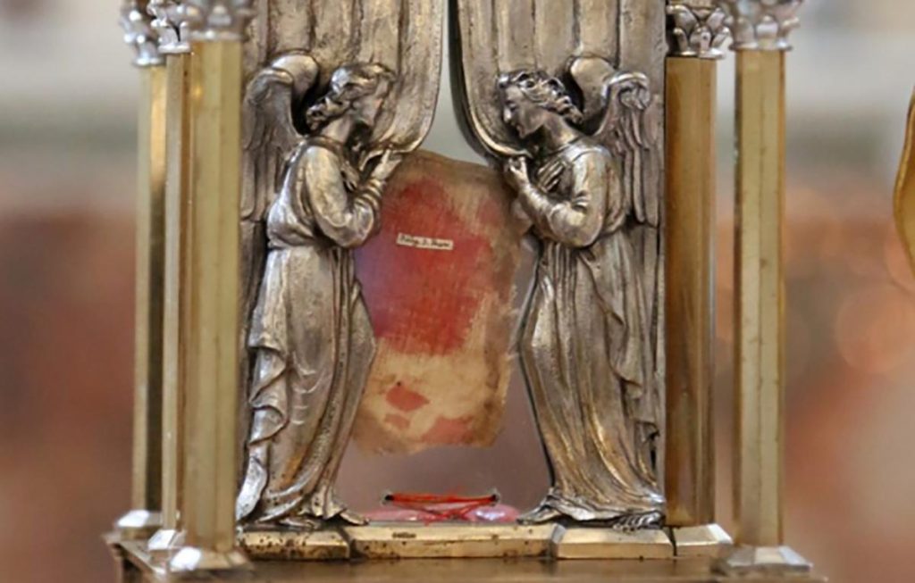 La reliquia. I frati de La Verna porteranno, per la venerazione popolare, il panno di lino, custodito in un reliquiario in bronzo, macchiato con il sangue del Santo, che uscì dal suo costato. È lo stesso panno con cui ogni anno, il 17 settembre, anniversario delle stigmate, il ministro generale dell’ordine francescano dei Frati Minori, impartisce la benedizione all’Italia intera dal monte de La Verna.