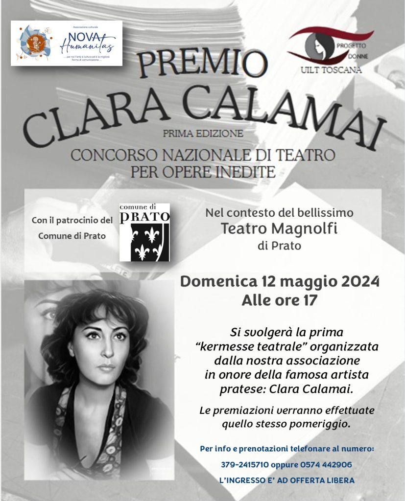 L’associazione Nova Humanitas A.P.S., grazie anche al patrocinio del Comune di Prato, ha organizzato la prima edizione di una kermesse teatrale dedicata a Clara Calamai, che verrà effettuata presso il Teatro Magnolfi domenica 12 maggio alle ore 17. L’associazione, che si occupa di arte ma prevalentemente di teatro, ha voluto così omaggiare la grande attrice pratese, creando un concorso di monologhi e corti in suo onore.