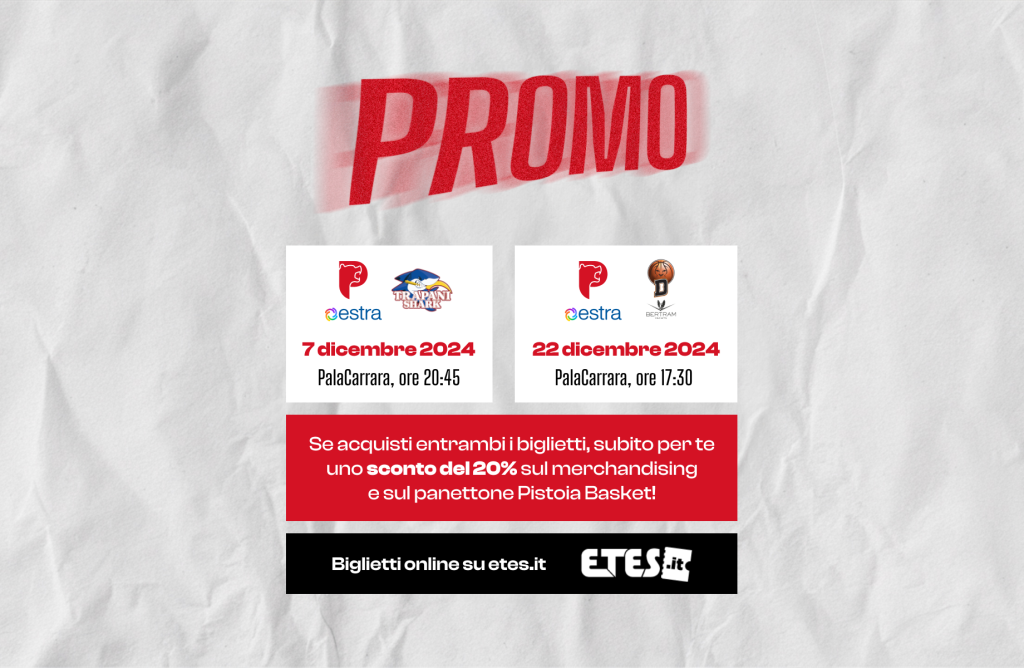L’importante novità per queste due partite è che, con l’acquisto in prevendita di entrambi i biglietti, si potrà avere uno sconto del 20% su tutti i prodotti del merchandising ufficiale del Pistoia Basket all’interno del nostro store, così come dei panettoni natalizi griffati Le Delizie. Per poter usufruire della speciale promozione, basterà presentarsi al “PB Experience” muniti dei biglietti già acquistati.