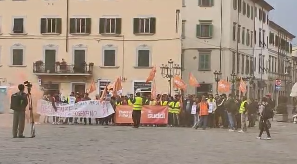 Una cinquantina di persone hanno partecipato oggi pomeriggio alla manifestazione organizzata dal Sudd Cobas per chiedere tempi certi per il rilascio dei permessi di soggiorno e la fine delle code con cui i richiedenti, notte e giorno, si trovano spesso a dover fare i conti. I manifestanti hanno sfilato mostrando striscioni ed intonando cori in corteo fino alla Prefettura.
