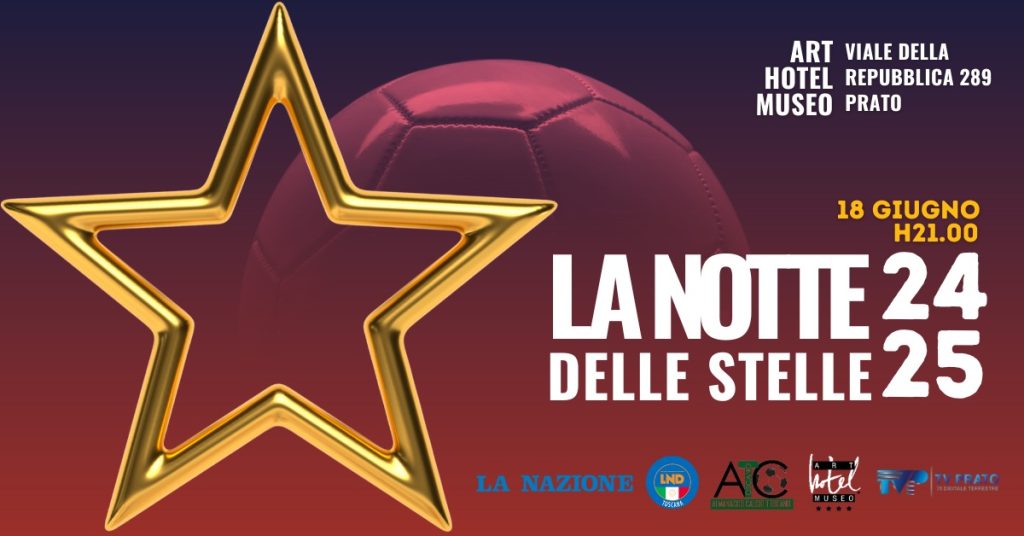 Notte delle Stelle 2025: ecco tutti i premiati. Torna l’appuntamento più atteso per i riconoscimenti dei “migliori” della stagione 2024/25 in Eccellenza e Promozione, organizzato come sempre da Tv Prato e Almanacco del Calcio Toscano in collaborazione con La Nazione. La serata di premiazione si terrà mercoledì 18 giugno alle ore 21 presso l’Art Hotel Museo di Prato (viale della Repubblica 289), a due passi dal Museo Pecci accanto all’uscita di Prato Est dell’autostrada Firenze-Mare.