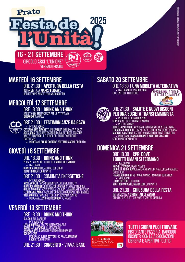 La festa si concluderà domenica 21 settembre con l’incontro “Cpr: dove i diritti umani si fermano”, alle ore 18.30. Parteciperanno la deputata PD Rachele Scarpa, Gabriele Terranova della Camera Penale di Prato e responsabile CPR di Uopi, e Francesco Lorini del Network Against Migrant Detention. L’incontro sarà moderato da Elena Dottore dei GD e da Martina Cacciato e Maria Logli del PD Prato.