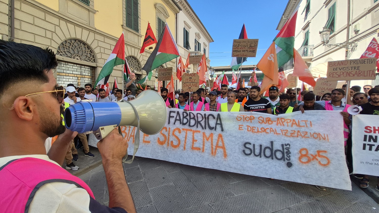Circa trecento persone con striscioni e bandiere – molte della Palestina – hanno manifestato per chiedere “diritti e dignità nelle filiere del Made in Italy”. Una nuova protesta, rumorosa a pacifica, promossa dagli operai pakistani e bengalesi che lavorano nelle aziende del comparto moda. A scatenarla l’episodio di violenza avvenuto nei giorni scorsi davanti alla stireria l’Alba di Montemurlo.