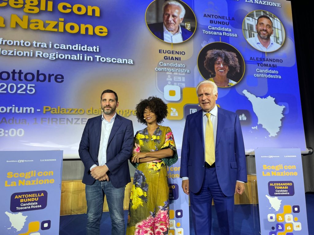Oltre un’ora di confronto sui temi caldi per la Toscana: sanità, sicurezza, lavoro, trasporti. A pochi giorni dal voto, al palacongressi di Firenze i candidati presidente di Regione Eugenio Giani per il centrosinistra, Alessandro Tomasi per il centrodestra e Antonella Bundu di Toscana Rossa hanno risposto alle domande dei giornalisti del quotidiano La Nazione, che ha organizzato il confronto. Scintille sui Cpr, i centri di permanenza per i rimpatrio oggi assenti in Toscana: centri utili per Tomasi per evitare che gli agenti di polizia “siano distolti dal portare in altri cpr fuori regione i criminali trovati in strada”, “forme legali di tortura” secondo Bundu, mentre Giani ha parlato di “luoghi di detenzione impropria”, in mancanza di convenzioni internazionali per i rimpatri. Su economia e lavoro, Giani ha sottolineato i dati positivi dell’occupazione e la tenuta del manifatturiero in Toscana. Tomasi ha chiesto più attenzione per le piccole e medie imprese. Bundu ha parlato dei tavoli di crisi ancora senza soluzione. Posizioni distanti anche sul trasporto pubblico. Giani ha sottolineato che in futuro grazie al tunnel dell’alta velocità a Firenze, potrà essere potenziato il servizio ferroviario regionale. Bundu e Tomasi hanno criticato il servizio di trasporto pubblico su gomma dopo la gara unica regionale.