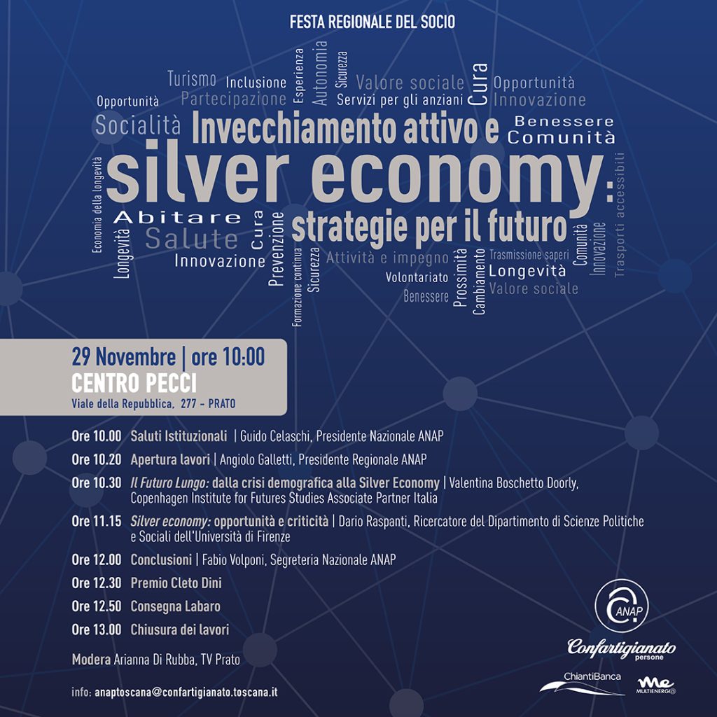 Il programma della Festa prevede, dopo i saluti istituzionali del presidente nazionale dell’Associazione Guido Celaschi e di quello regionale Angiolo Galletti, un convegno dal titolo “Invecchiamento attivo e Silver Economy: strategie per il futuro”. Il primo intervento,“ Il Futuro lungo: dalla crisi demografica alla Silver Economy”, sarà di Valentina Boschetto Doorly, del Copenhagen Institute for Futures Studies. A seguire il contributo di Dario Raspanti, ricercatore dell’Università degli Studi di Firenze, sul tema “ Silver Economy: opportunità e criticità”. Le conclusioni sono affidate a Fabio Volponi della segreteria nazionale di ANAP. Il convegno sarà moderato dalla giornalista di Tv Prato Arianna Di Rubba. Nel corso della Festa verranno assegnati anche i premi “Cleto Dini” alle imprese giovanili e femminili toscane che si sono distinte per l’impegno nel sociale e nel lavoro.
