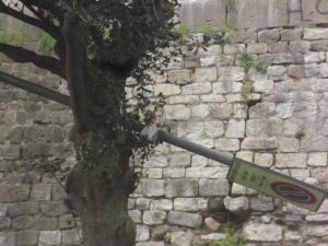 Atto vandalico sul retro del Castello dell’Imperatore, cartello stradale sradicato e abbandonato su un albero