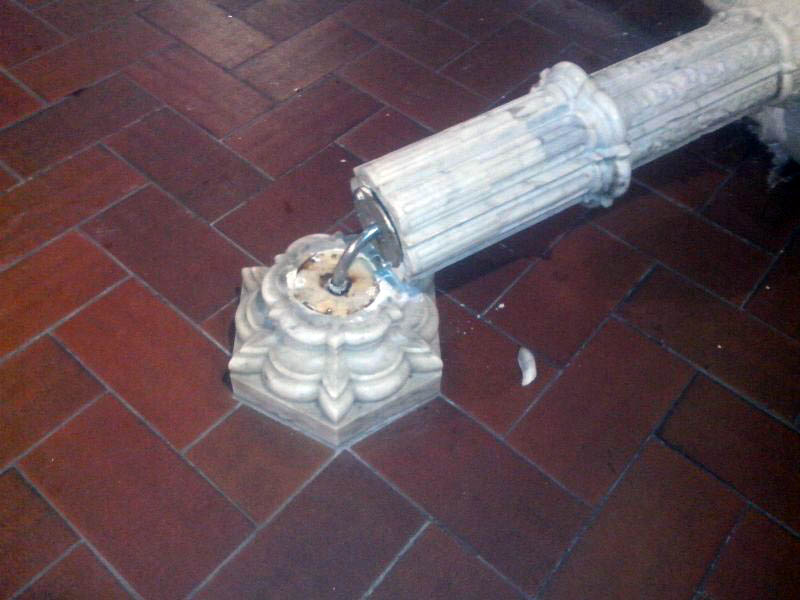 Secondo il racconto del testimone l’autore del gesto è un uomo tra i quaranta e i cinquanta anni, europeo probabilmente italiano. Era visibilmente alterato e si comportava in modo violento. Dai primi rilievi si capisce che l’uomo ha tentato di staccare anche l’acquasantiera gemella che si trova accanto a quella danneggiata. Per fortuna alcuni anni fa le due opere sono state restaurate e rinforzate con un’anima di ferro. Proprio questo “scheletro” ha permesso alla seconda acquasantiera di resistere e alla prima, quella danneggiata, di cadere “dolcemente” a terra e quindi di evitare di rompersi in modo grave.