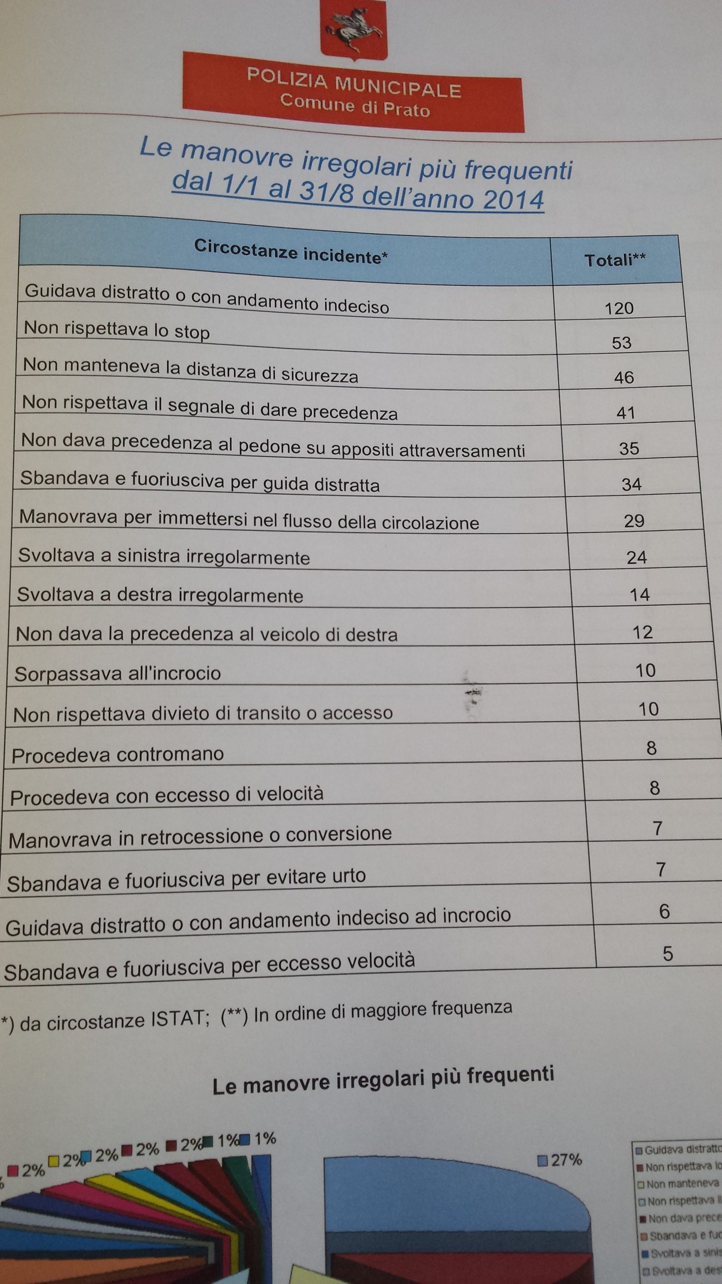 Nei primi otto mesi del 2014 si conferma in calo il trend degli incidenti stradali in città. In totale ci sono stati 792 sinistri, di cui 246 solo con danni e 540 con feriti. Il numero, come detto, è in calo rispetto ai primi otto mesi del 2013 quando ci furono 860 incidenti. La diminuzione in termini statistici è del 7,91%. C’è però anche un dato negativo se paragonato all’anno scorso, si tratta di quello relativo agli scontri mortali: 6 quest’anno, 5 dal gennaio all’agosto del 2013. I soggetti più a rischio sono i conducenti di veicoli a due ruote e i pedoni. Su sette persone decedute, infatti, una è un pedone, quattro conducenti di mezzi a due ruote.