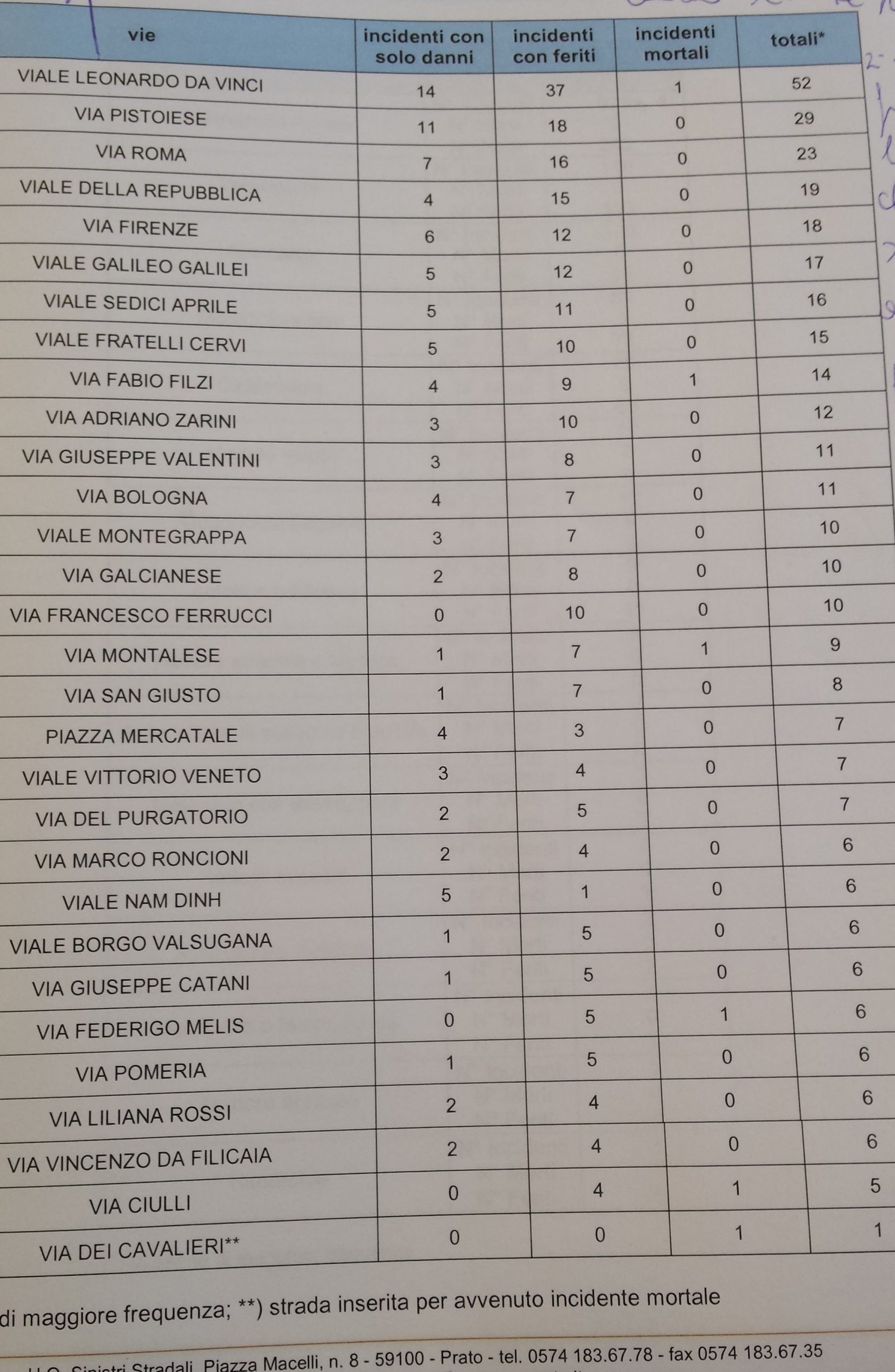 La maglia nera di strada più pericolosa in città spetta alla declassata con 52 scontri, di cui uno mortale. Poi via Pistoiese con 29 incidenti, via Roma e viale della Repubblica. Particolare attenzione al volante pure in via Firenze, viale Galilei, viale XVI Aprile e via fratelli Cervi. Il maggior numero di incidenti stradali si è verificato nel mese di maggio, mentre il giorno peggiore per gli automobilisti è il lunedì nella fascia dalle 11 a mezzogiorno e in quella dalle 18 alle 19.
