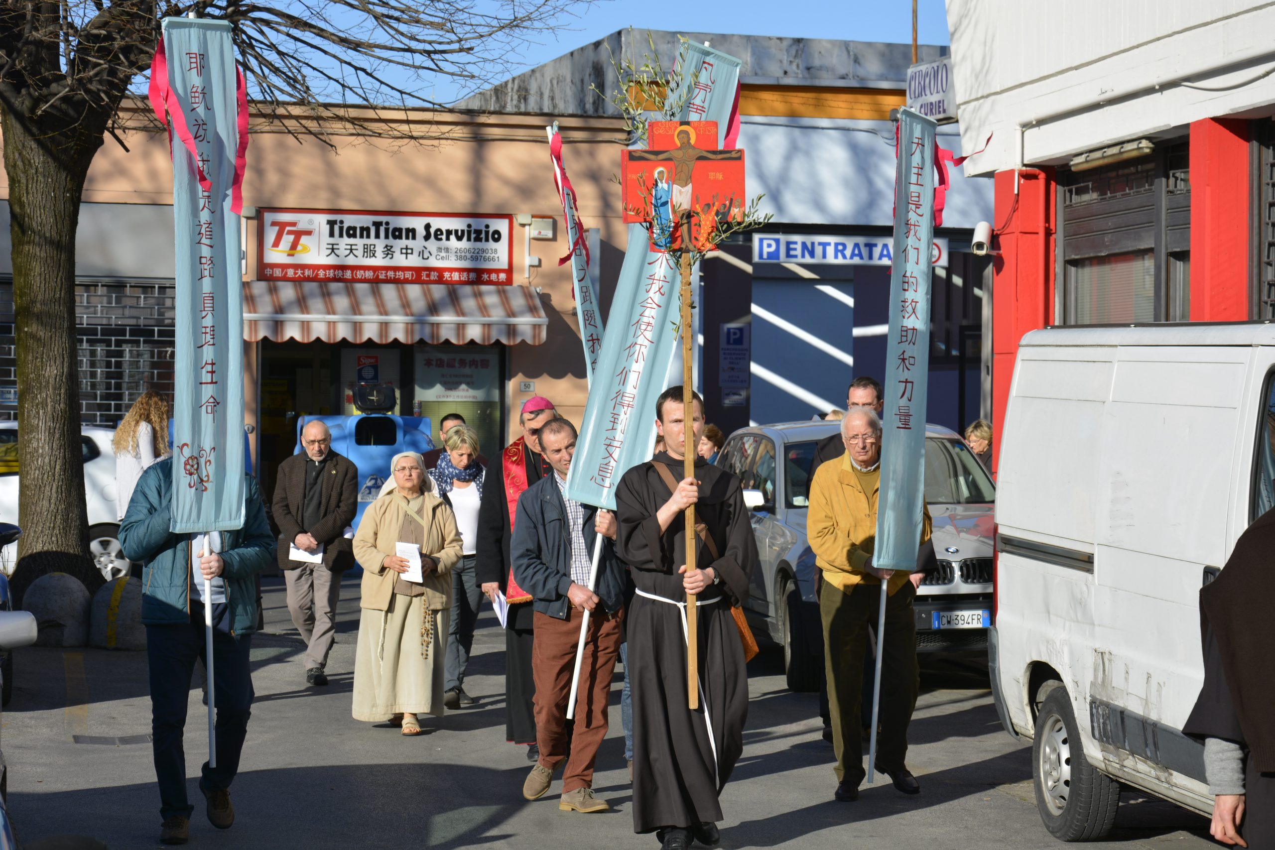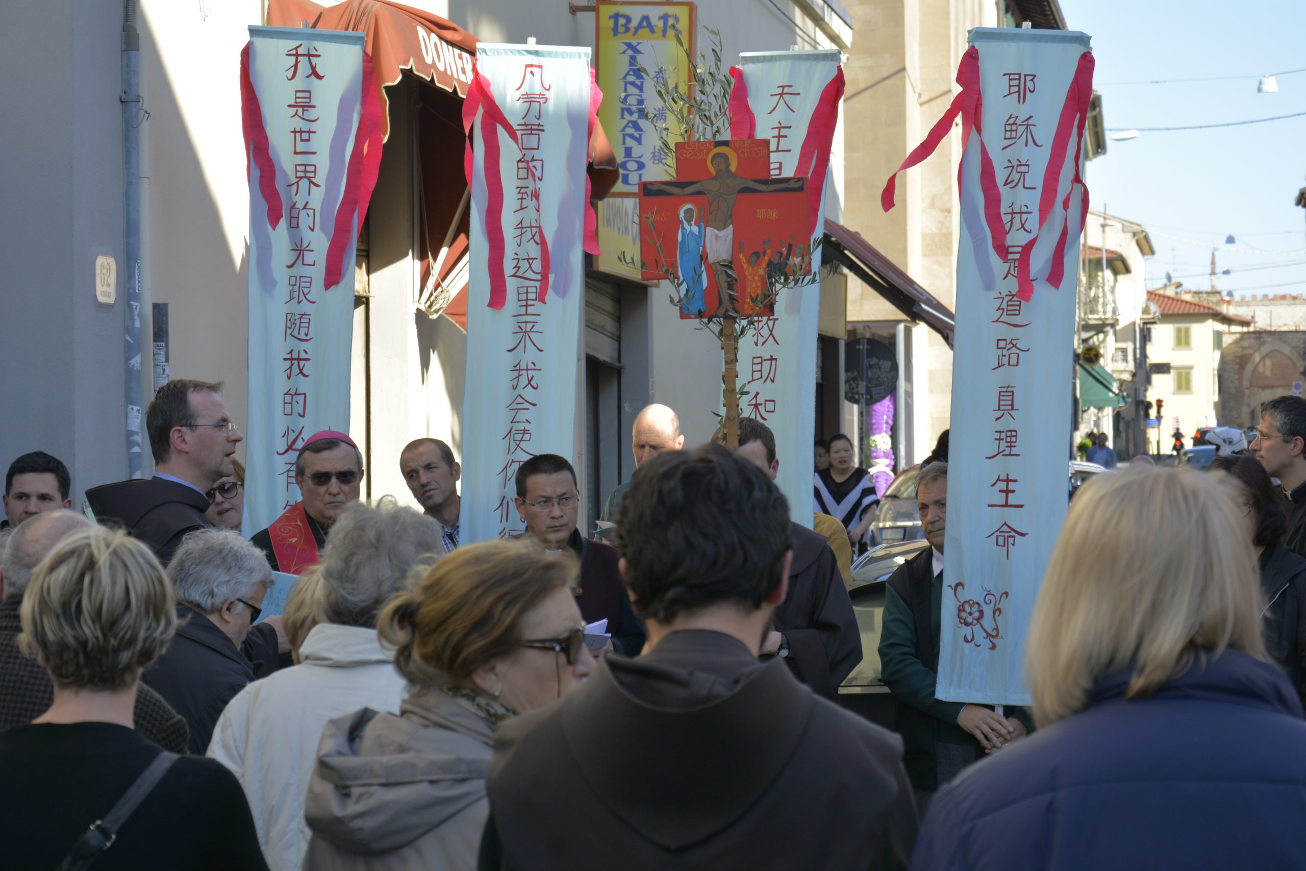 “Vogliamo costruire dei ponti e darci la mano: auguro una buona Pasqua non solo ai cittadini cinesi che hanno partecipato, ma anche a quelli che ci hanno visto passare e, anche per un momento, si sono fermati ad ascoltare”: così il vescovo Franco Agostinelli ha concluso la via crucis organizzata, come di consueto, dalla comunità cattolica cinese per le strade della Chinatown pratese. In tutto circa cinquanta persone hanno percorso una parte di via pistoiese, via Marini e via Filzi, ma sono stati tanti i cittadini orientali che si sono fermati per uno sguardo o per ascoltare le preghiere e le riflessioni; diversi anche quelli che, dalle finestre di casa, hanno filmato la processione con il proprio smartphone. “Sono qui – ha detto mons. Agostinelli, a conclusione del percorso – per perseguire un sogno: che questo nostro popolo diventi numeroso! Ogni anno proponiamo questa via crucis nella Chinatown pratese per intrecciare dei rapporti con questa grande comunità”.