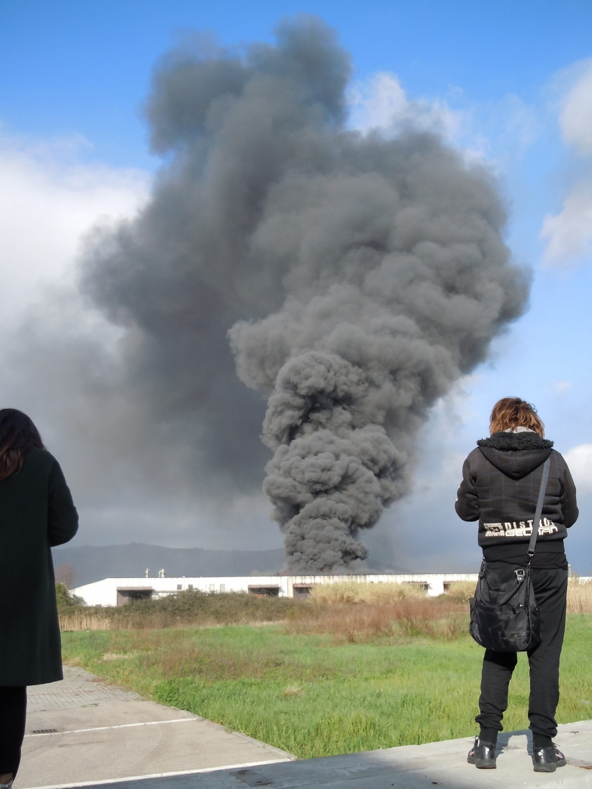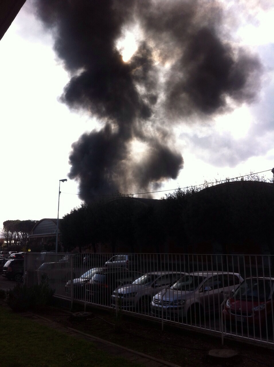 Grosso incendio al Macrolotto, con due operai che hanno rischiato la vita dopo un incidente sul lavoro: è accaduto questo pomeriggio in via Onorio Vannucchi, intorno alle 16, quando si è alzata una enorme colonna di fumo da una fabbrica al cui interno erano presenti stoffe sequestrate due anni fa ad una ditta cinese. Due uomini stavano installando carta catramata sul tetto del capannone, danneggiato dal vento del 5 marzo scorso, quando inavvertitamente un pezzo di materiale incandescente è caduto all’interno, attraverso il lucernario spezzato, incendiando gli scampoli e le pezze. Questo ha provocato un enorme incendio: per salvarsi, i due uomini si sono buttati all’interno dello stabile, visto che i pancali con la merce raggiungevano quasi il soffitto. Hanno provato a spegnere l’incendio con un estintore, rimanendo però chiusi dentro per alcuni minuti, visto che non avevano le chiavi. Per fortuna, due operai della EuroMed, una vicina azienda farmacologica – chiamati da una persona che ha sentito urlare e picchiare dall’interno – hanno sfondato la porta con un muletto, permettendo l’uscita dei due malcapitati, anneriti dal fumo e visibilmente sotto shock.