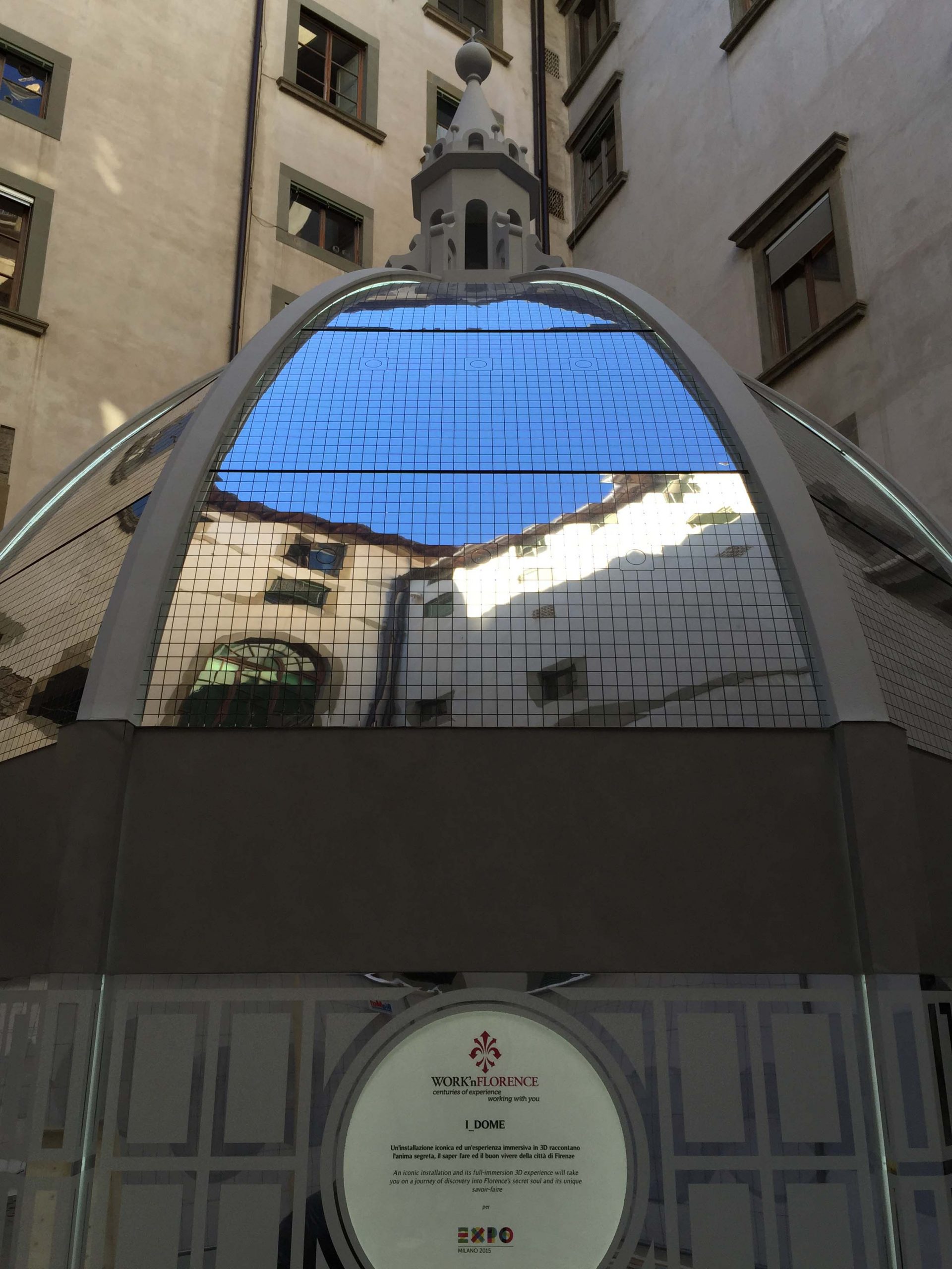 Ideata da Alessandro Moradei con Elena Mari, e messa a punto da Machina, la cupola multimediale è un progetto di PromoFirenze che ha ricevuto il patrocinio, appunto, da Expo2015. I_Dome – alto 8,5 metri e largo 6 -, riproduce nella forma e nelle proporzioni architettoniche la Cupola del Brunelleschi, ma è costruito con materiali e tecniche contemporanee. Pietra e mattoni lasciano il posto a materiali ecosostenibili, facilmente stampabili e lavorabili. Lo scheletro consiste in un tubolare di ferro, mentre le superfici esterne sono ricoperte con il Dibond, materiale dalle qualità riflettenti analoghe a quelle degli specchi in vetro. Il pavimento è realizzato in Betonwood, composto da lastre di cemento grezzo ottenute da fibre legnose di pino. Nel design e nell’utilizzo dei materiali contemporanei impiegati per la sua costruzione, I_Dome vuole dimostrare la forte identità semantica e la capacità del territorio di fare impresa, ricerca e sviluppare la creatività dell’intera area fiorentina.