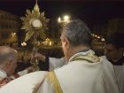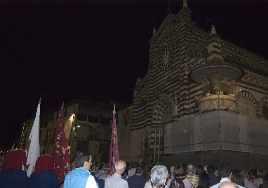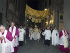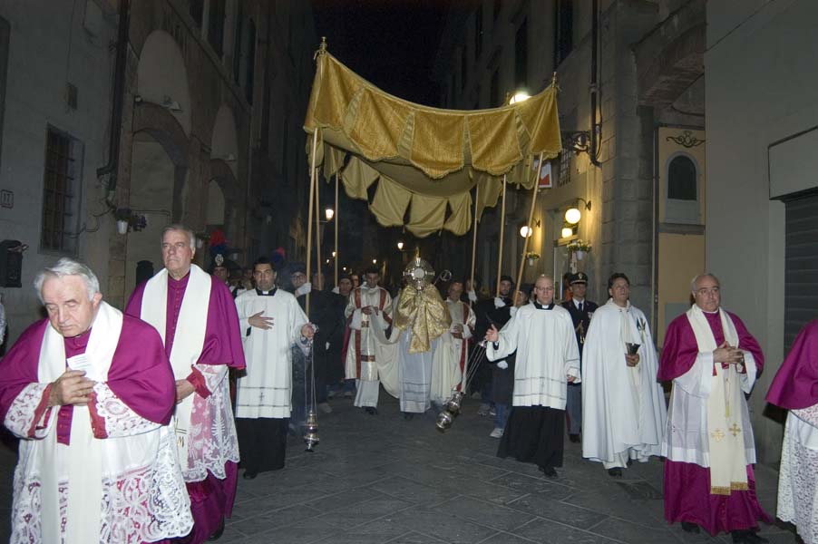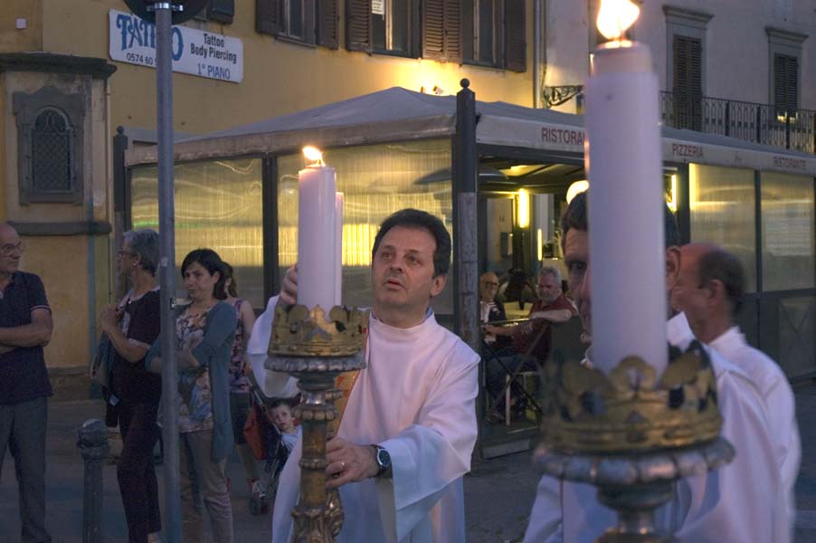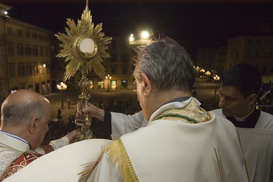 «La presenza del Signore si coglie quando siamo capaci di coglierlo nella fede – ha detto il Vescovo rivolgendosi alla piazza dal pulpito di Donatello – non nei segni dell’onnipotenza e del miracolistico, della forza e dell’imposizione, ma della fragilità e disponibilità di un pezzo di pane, di un bimbo, di un povero, di un profugo, di un malato». Nessuna riappropriazione dunque ma la volontà di riaffermare la presenza della Chiesa pratese con il suo messaggio evangelico in tutte le strade del centro, soprattutto in quelle dimenticate. Il passaggio della processione poi è stato accolto con favore e soddisfazione anche nelle altre vie comprese nel percorso, come via del Serraglio, via Guizzelmi e via Muzzi, con alcune vetrine illuminate a festa dai negozianti.