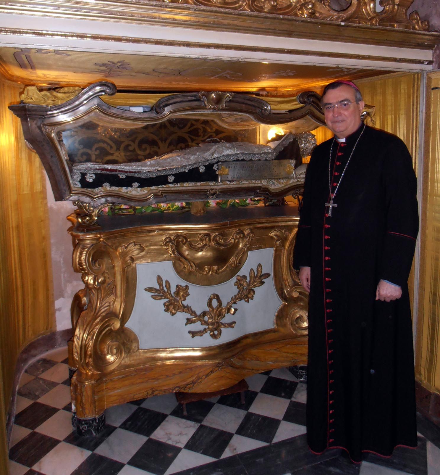 (Il Vescovo Agostinelli fotografato accanto all’urna con il corpo della Santa)