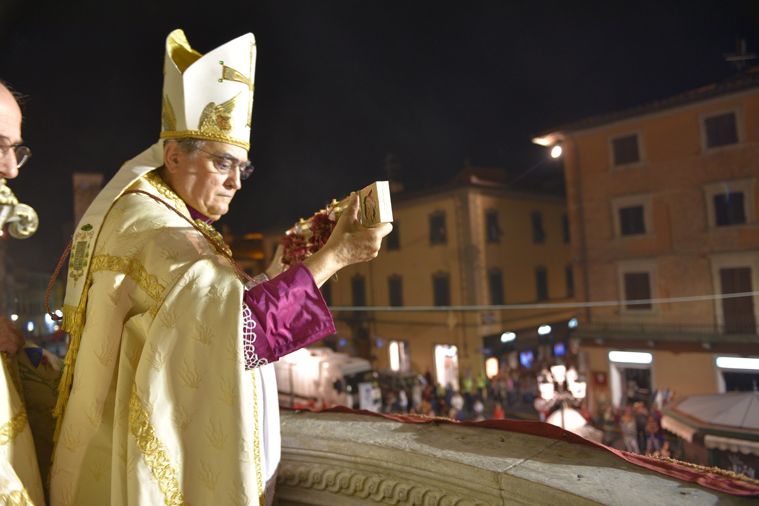 Il vescovo Franco Agostinelli ha indossato i paramenti sacri e insieme al sindaco Biffoni e alle altre autorità presenti è entrato nella Cappella della Sacra Cintola.