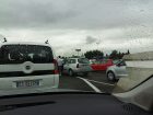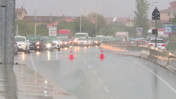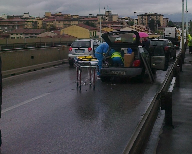 Tra allagamenti e incidenti – fra cui un tamponamento in tangenziale sul cavalcavia di Borgonuovo che ha coinvolto due auto e un furgone (nella foto sotto) – chi si doveva spostare lungo gli assi principali della città ha impiegato fino a un’ora per percorrere pochi chilometri.