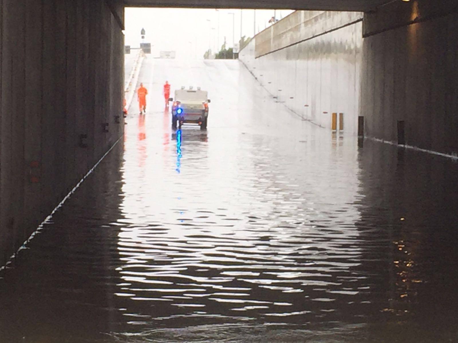 La pioggia che da stamani è caduta su Prato e provincia sta creando forti disagi in città, con il traffico che è andato in tilt per ore tra la tarda mattinata e metà pomeriggio. Il sottopasso della Tangenziale all’altezza del nuovo ospedale è stato chiuso poco prima delle 13, in direzione nord, perché allagato (nella foto sopra) e riaperto soltanto alle 16. Parzialmente allagati anche il sottopasso della Declassata all’altezza dell’Esselunga, chiuso in direzione Pistoia per tre ore e quello della Questura, inibito al traffico attorno alle 16,30 per le operazioni di pulitura delle caditoie. Le code, in quest’ultimo caso, per chi entrava in città dall’autostrada, partivano dal casello.