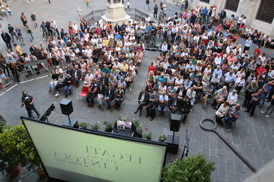 Legati da una Cintola, in piazza del Comune la conversazione tra Montanari e Petrà: «La reliquia continua a fare “il suo mestiere” se ancora oggi unisce la città» VIDEO e FOTO