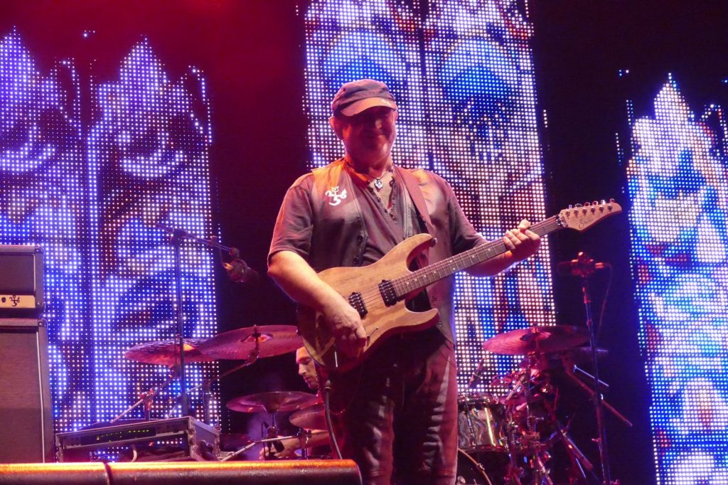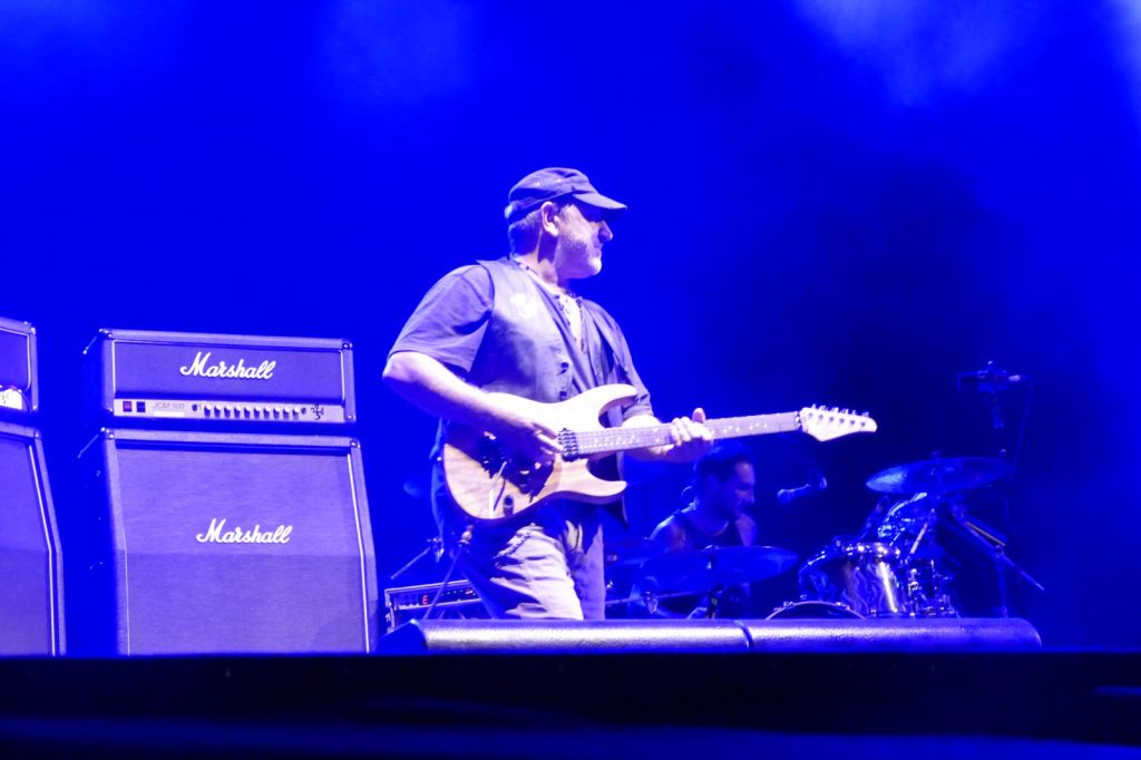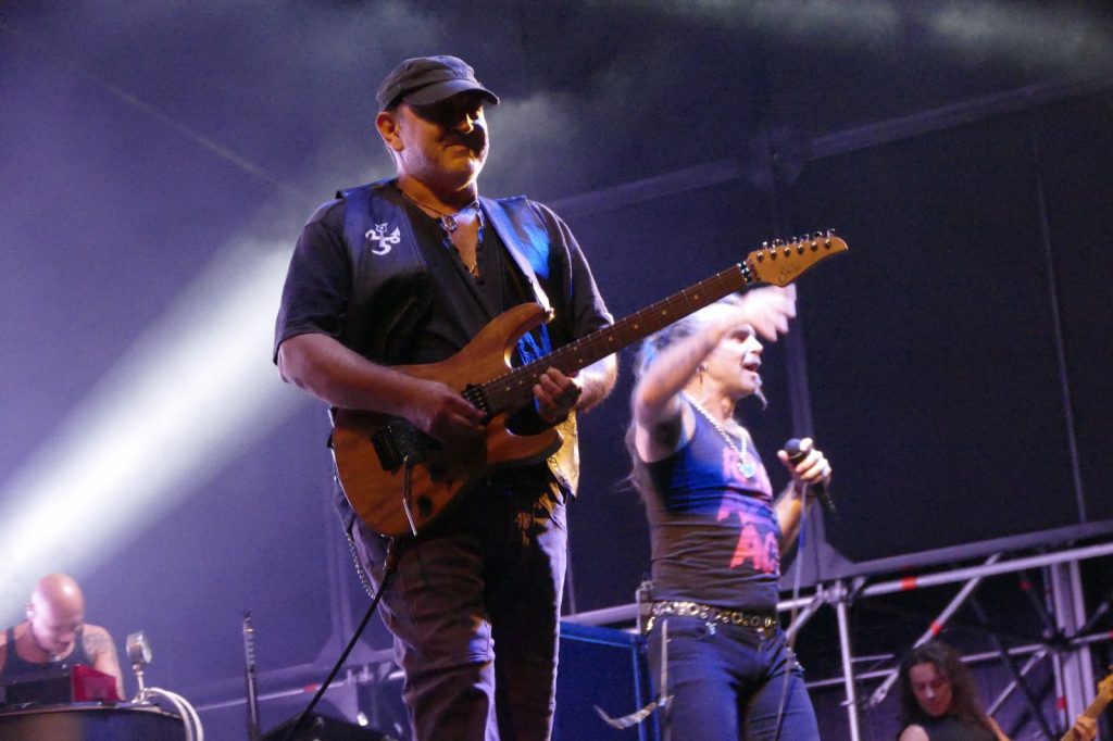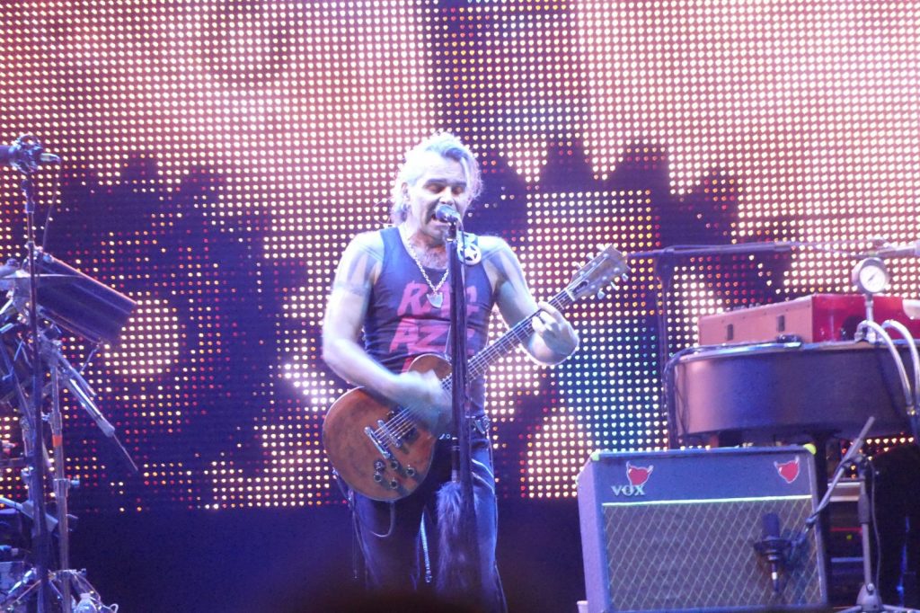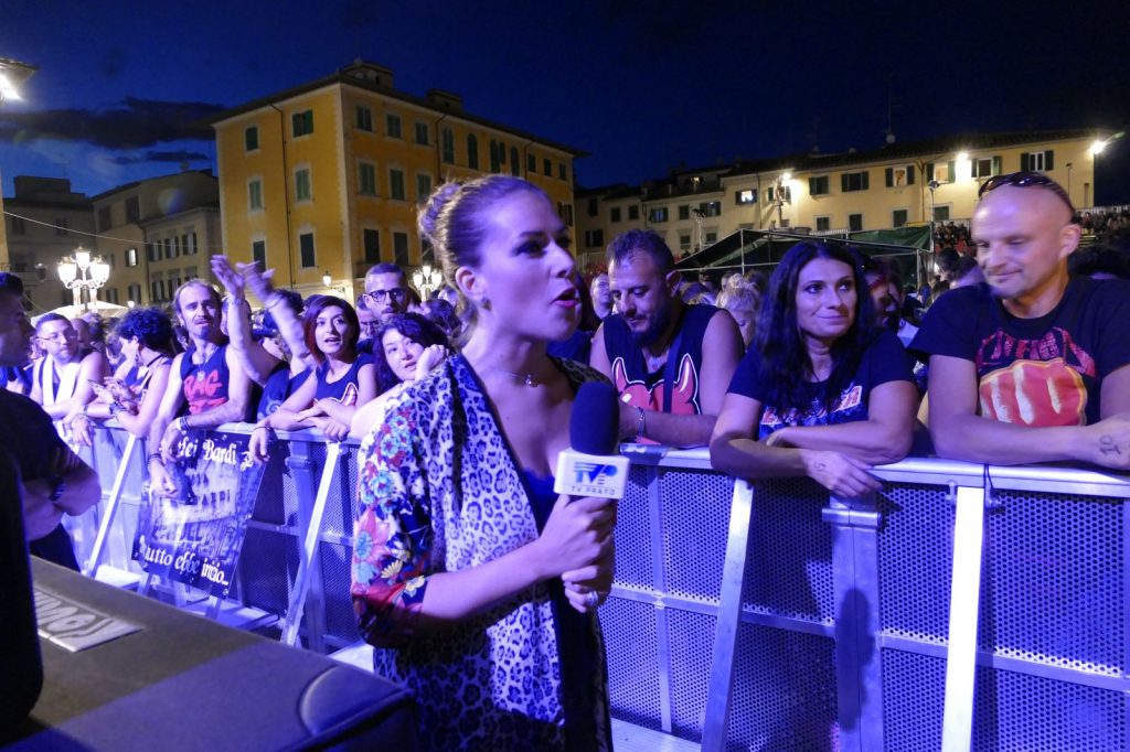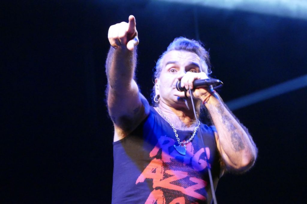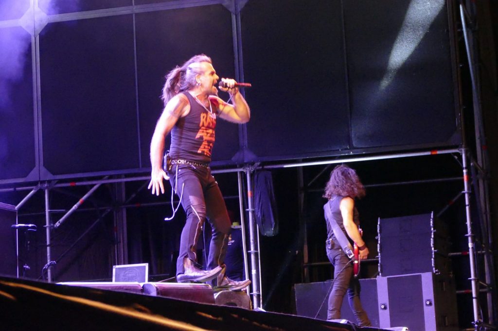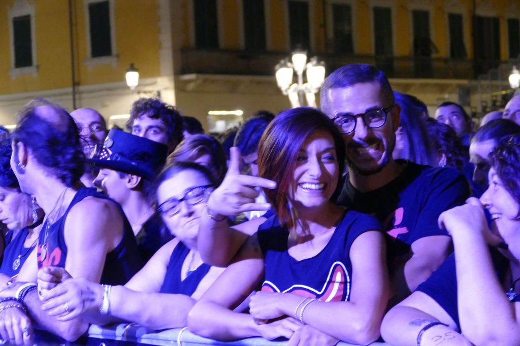 Al suo fianco, il co-fondatore del gruppo, Ghigo Renzulli. E poi, Luca Martelli alla batteria, Ciccio Licausi al basso e Fabrizio Simoncioni alle tastiere. Il risultato è puro rock. Con tanto di “tuffo” finale sulla folla.