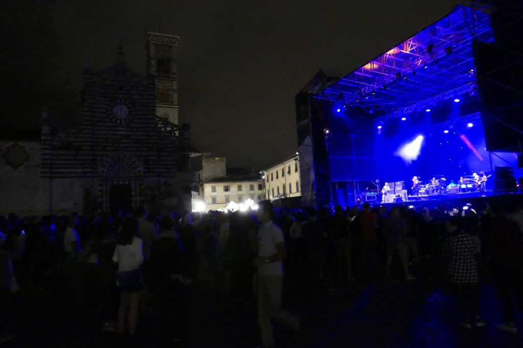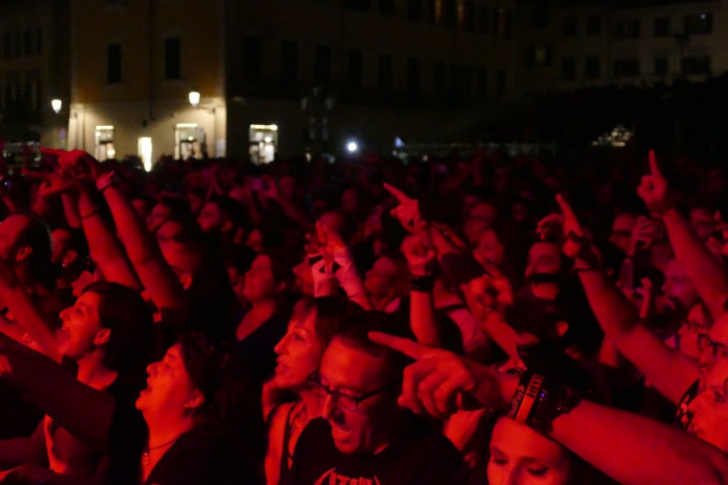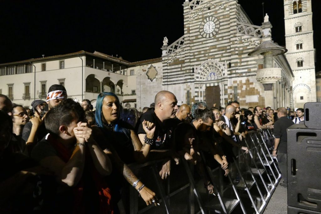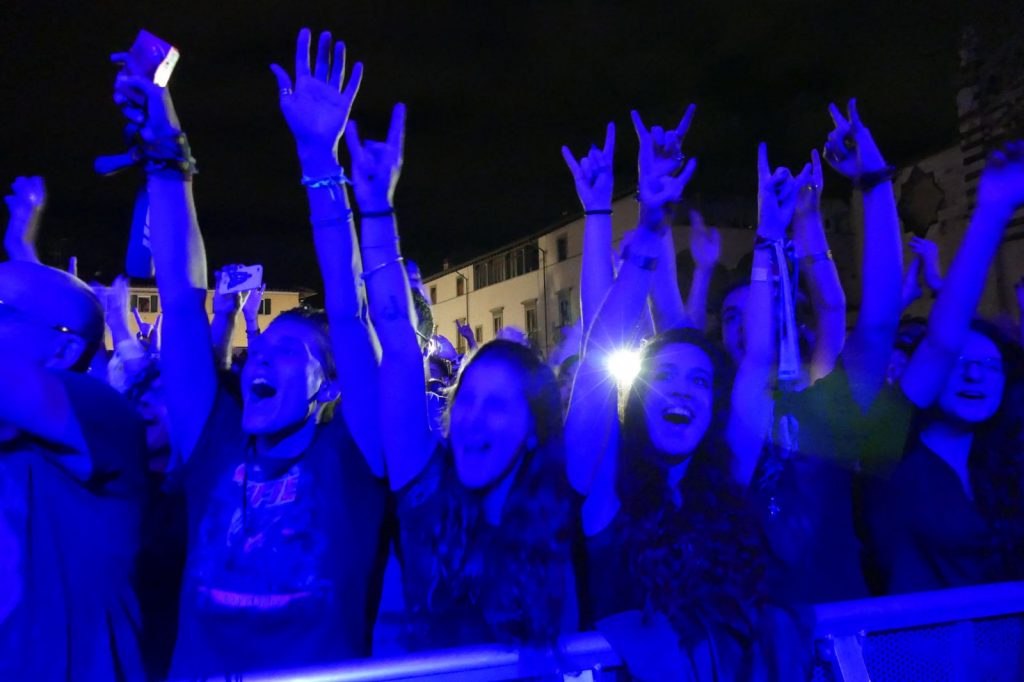La pioggia non basta a spegnere gli animi dei fan, accorsi in piazza Duomo per assistere allo show trascinante dei fiorentinissimi Litfiba. Non sembrano passati quasi 40 anni dal loro esordio, nel 1980 in una Firenze che li vide spiccare il volo da uno scantinato in via de’ Bardi.