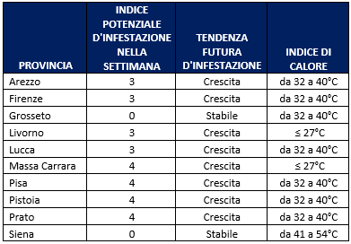 Secondo i dati del bollettino meteo di Vape Foundation divulgati da Anticimex, azienda internazionale specializzata nel Pest Management e nei servizi di igiene ambientale, nella settimana dal 26 luglio all’1 agosto in Toscana sono Massa Carrara, Pisa, Pistoia e Prato le province con l’indice potenziale di infestazione di zanzara tigre più alto, in una scala di intensità da 0 a 4. Nelle province di Arezzo, Firenze, Livorno e Lucca si registra un livello medio-alto (3), mentre a Grosseto e Siena l’allerta è nulla. In quasi tutte le province la tendenza futura è in crescita, eccetto Grosseto e Siena, mentre l’indice di calore compreso tra i 41 e i 54 gradi a Siena, tra i 32 e i 40 gradi ad Arezzo, Firenze, Grosseto, Lucca, Pisa, Pistoia e Prato, e inferiore o uguale ai 27 gradi a Livorno e Massa Carrara.