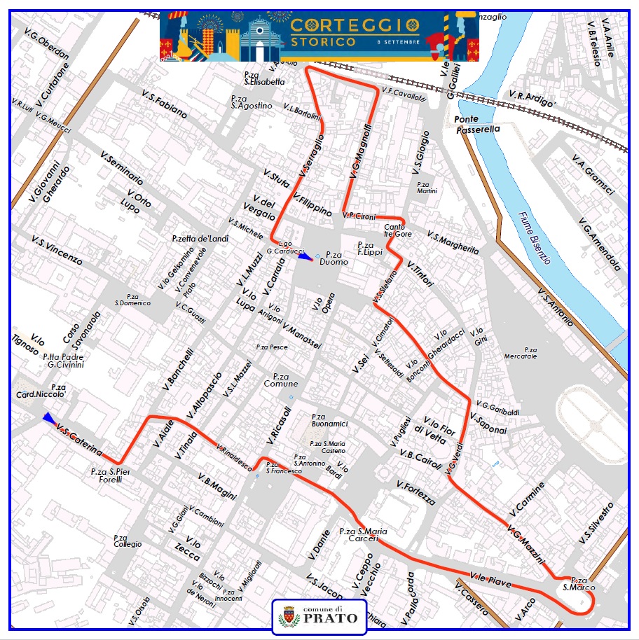 Ecco il percorso che compiranno i circa 400 figuranti appartenenti ai vari gruppi storici partecipanti alla tradizionale manifestazione dell’8 settembre in occasione della Madonna della Fiera, la festa più cara ai pratesi.