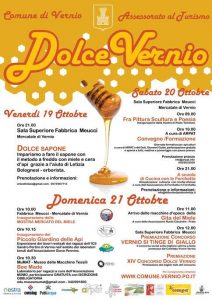 La tre giorni della dolcezza sta per andare in scena a Vernio. Dal 19 al 21 ottobre torna infatti Dolce Vernio, manifestazione dedicata al miele e allo straordinario mondo delle api. Il programma di quest’anno è denso di eventi: formazione, laboratori, gita del miele, mostre e il giardino delle api, oltre alle vetrine in giallo, alla scuola di cucina e ad altre novità. Già pronti i mieli in concorso, che quest’anno sono 86, suddivisi tra castagno, millefiori, acacia e mieli vari e provenienti come sempre da tutte le province toscane. “La Toscana è una terra di apicoltori e i numeri del concorso e della mostra mercato, una delle vetrine regionali più importanti, lo dimostrano. I mieli che verranno giudicati saranno testimoni dell’eccellenza del prodotto. Come sempre abbiamo lavorato molto su programma, che offre eventi per tutti i gusti, dalla scuola di cucina a quella per fare il sapone, dai laboratori per i bambini alla formazione aperta anche al pubblico”, spiegano il sindaco di Vernio Giovanni Morganti e il vicesindaco Francesca Bolognesi, anima organizzatrice dell’evento. Promosso dall’assessorato al Turismo del Comune di Vernio e organizzato in collaborazione con ARPAT, l’Associazione Regionale Produttori Apistici della Toscana, Dolce Vernio seleziona i migliori mieli tipici di produzione regionale della Toscana allo scopo di incentivare la produzione di qualità, promuovere il consumo presso il grande pubblico e diffondere la cultura del miele locale tipico. Il programma di “Dolce Vernio”