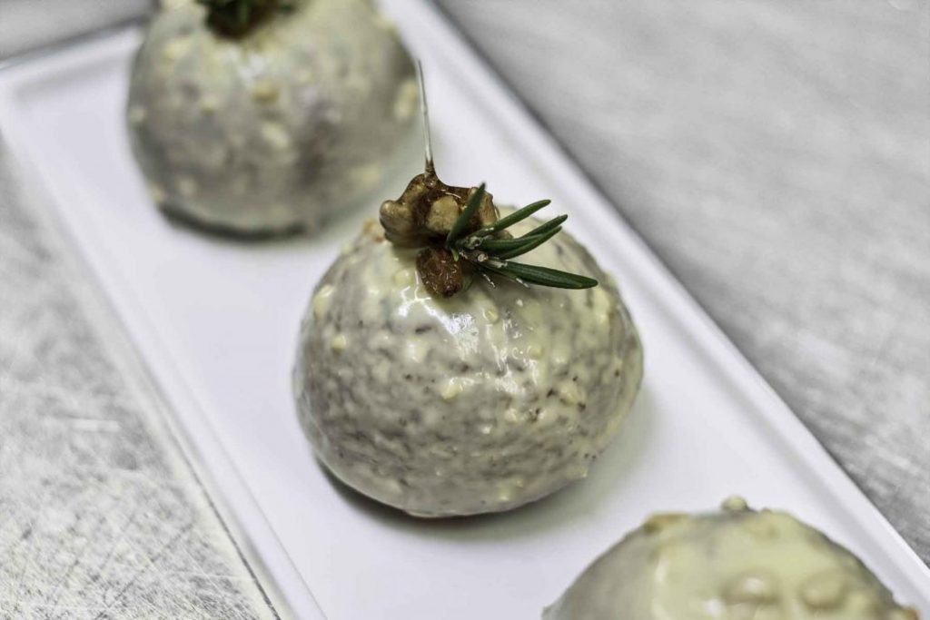 Il colore, bianco come l’inverno, dai riflessi argentei, lascia sognare ma all’interno si scoprono i toni caldi e bruni della castagna, la castagna della Val Bisenzio, una vallata pressoché intatta, già appenninica, a nord della città, dalla quale deriva quella meravigliosa farina di castagne utilizzata qui. La consistenza è morbida, grazie anche all’uvetta all’interno e all’uso dell’olio extravergine di Bacchereto. Morbida ma non troppo, perchè già sulla glassa “pinguino” all’esterno, data da un velo leggero di cioccolato bianco, troviamo una granella di pinoli che aggiunge leggera croccantezza. Anche all’interno scaglie di frutta secca che la noce caramellata sul top ricorda. A completare il tutto, non poteva mancare un accenno di “ramerino” come la tradizione vuole, appena un ciuffo. Chi vuole può gustarlo anche con della panna accanto che regala ancor più grazia. Il risultato al palato, con una piccola citazione savoury, è un tripudio di sapori caldi, familiari, confortevoli quasi, ma delicati e compositi come solo un grande maestro dell’arte dolciaria poteva regalare.