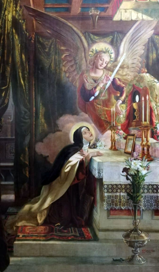 L’opera. La pala, che raffigura Santa Teresa in Adorazione sotto lo sguardo dolce di un angelo, si trova entrando a sinistra sopra il primo altare laterale e aveva bisogno di un intervento conservativo che riuscisse a valorizzare la bellezza del dipinto, soprattutto dei colori ormai sbiaditi dal tempo. L’ottimo lavoro compiuto da Bersellini, sotto la supervisione della Soprintendenza, non solo restituisce alla città un’opera di valore ma dà la possibilità di mettere in luce le evidenti qualità pittoriche di Giuseppe Catani Chiti, autore oggi non molto conosciuto al grande pubblico, ma che è stato tra i più noti e apprezzati artisti della sua epoca.