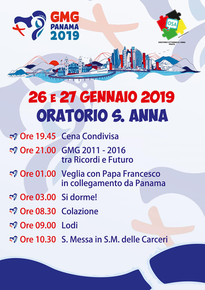 Per chi è rimasto a Prato.Sabato 26 gennaio, presso l’oratorio di Sant’Anna, in viale Piave, verrà trasmessa sul maxischermo dell’auditorium la veglia dei giovani con il Papa.