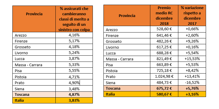Il nuovo anno si apre con una brutta notizia per oltre 97.000 toscani; tanti sono gli automobilisti che, secondo l’analisi fatta da Facile.it, avendo denunciato alle assicurazioni un sinistro con colpa avvenuto nel 2018, vedranno aumentare la propria classe di merito e, insieme ad essa, il costo dell’RC auto. Il dato è stato calcolato da Facile.it che, esaminando oltre 32.000 preventivi di rinnovo RC auto richiesti tramite il sito da automobilisti residenti in Toscana, ha evidenziato come il 4,87% degli utenti della regione abbia dichiarato di essere stato responsabile di un incidente nel corso del 2018, il che farà scattare l’aumento del costo dell’assicurazione. Il dato risulta addirittura superiore alla media nazionale (3,83%); la buona notizia, però, è che il valore regionale risulta in calo rispetto all’anno precedente, quando la percentuale di automobilisti toscani che erano ricorsi all’assicurazione per un sinistro con colpa era pari al 5,48%.