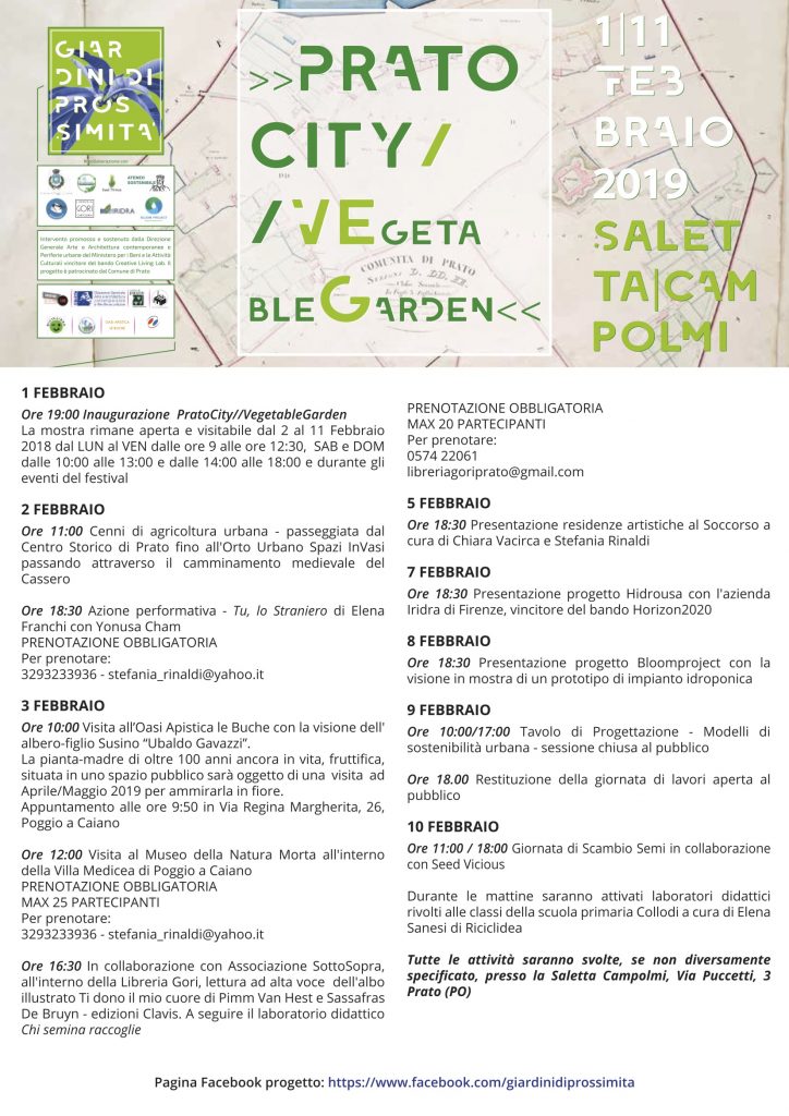 La prima fase prevede un festival sulla sostenibilità, PratoCity//VegetableGarden, che si svolgerà presso la Saletta Campolmi in via Puccetti 3 a Prato dall’1 all’11 Febbraio 2019. Il festival racconta con una mostra il tessuto urbano del territorio di Prato seguendo la storia secolare della presenza agricola e la trasformazione urbanistica della città legata all’affermazione industriale e alla ridefinizione e rifunzionalizzazione delle aree verdi nei secoli, arrivando al nuovo senso dello spazio verde-giardino come focus per la creazione di comunità.