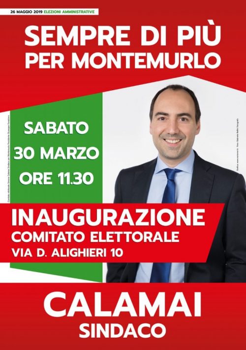 Il candidato sindaco del Partito democratico e della coalizione di centrosinistra di Montemurlo Simone Calamai inaugura domani, sabato 30 marzo, il suo comitato elettorale in via Dante Alighieri. L’appuntamento è per le ore 11.30. In quell’occasione il candidato raccoglierà le istanze della cittadinanza per tracciare le linee programmatiche della città di domani. Calamai ricopre attualmente la carica di vicesindaco della giunta Lorenzini e il partito ha trovato la quadra sul suo nome in tempi record: già a novembre 2018 ha presentato la sua candidatura nella cornice del caffè Victory. Ad appoggiarlo anche la lista civica “Sinistra per Montemurlo”.