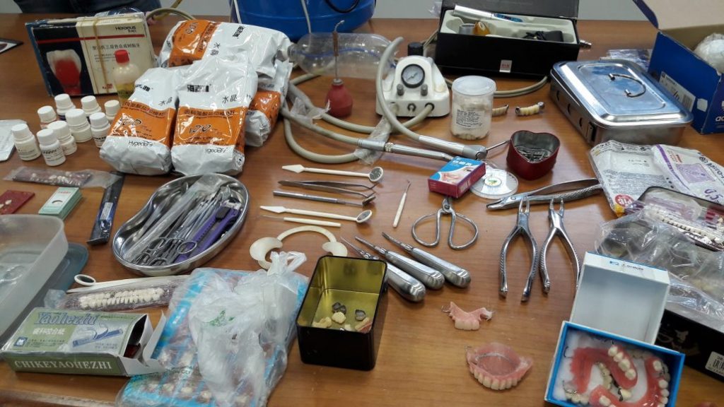 La Guardia di Finanza di Prato è arrivata al falso dentista, un cittadino cinese, dopo mesi di indagini. All’interno dell’immobile, privo di insegne, le Fiamme Gialle hanno rinvenuto e sequestrato medicinali e attrezzature varie, in particolare: fili per sutura chirurgica, una poltrona per le visite e gli interventi odontoiatrici in pessime condizioni (foto a destra), calchi e protesi dentarie, confezioni di farmaci cinesi, sacchetti contenenti polvere per calchi dentali ed altri strumenti tipici per la cura e l’estrazione dei denti. I locali versavano in condizioni igienico-sanitarie precarie.