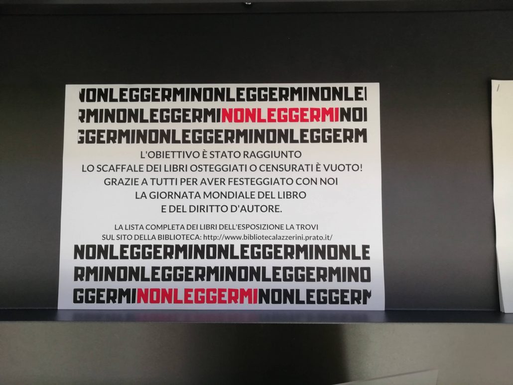 Così sullo scaffale allestito fino a qualche giorno fa nella Hall d’ingresso con più di 50 titoli, con la copertina rivestita completamente di nero poiché soltanto sfogliando le prime pagine era possibile scoprire il titolo e il “perché” della censura, ora campeggia il cartello “ Lo scaffale dei libri osteggiati e censurati è vuoto! Grazie a tutti per aver festeggiato con noi la Giornata mondiale del libro”.