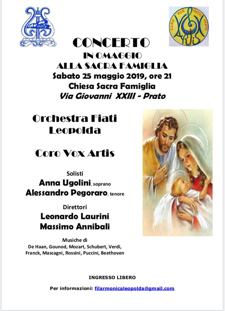 Sabato 25 maggio, alle 21, nella chiesa della Sacra Famiglia, in via Giovanni XXIII, si terrà un concerto dedicato proprio alla Famiglia di Nazareth. Si esibiscono: l’Orchestra di fiati Leopolda ed il Coro Vox Artis; solisti il soprano Anna Ugolini ed il tenore Alessandro Pegoraro. Dirigono Leonardo Laurini e Massimo Annibali. Saranno eseguite musiche di De Haan, Gounod, Mozart, Schubert; Verdi, Franck, Mascagni; Rossini, Puccini e Beethoven. L’ingresso è libero. Info filarmonicaleopolda@gmail.com.