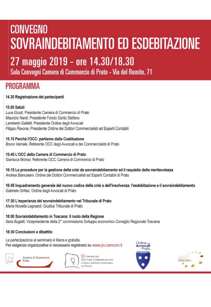 Sovraindebitamento ed esdebitazione. Sono i temi al centro del convegno organizzato dalla Camera di Commercio di Prato e in programma per lunedì 27 maggio, dalle 14.30 alle 18.30, nella Sala Convegni dell’Ente.