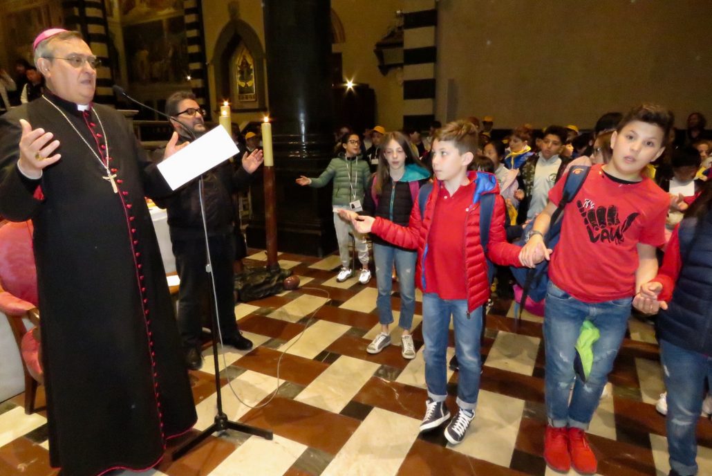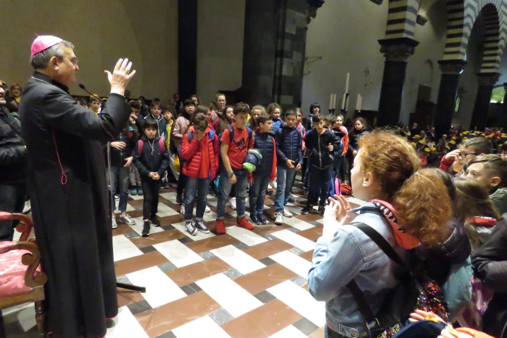 Il Signore, ha detto il vescovo, ci vuole bambini nel guardare il mondo e vivere la fede: “Noi adulti dobbiamo avere lo stesso cuore dei piccoli – ha spiegato Agostinelli nel suo saluto -. Lo stesso atteggiamento dei bambini, la stessa fiducia nei confronti dell’altro. Dobbiamo avere fiducia nel Signore, affidarci a lui. Voglio ringraziare Don Serafino, le suore, gli altri parroci e soprattutto le insegnanti dei ragazzi – ha aggiunto il vescovo -. Educare non è facile, è fatica a volte. Ma noi siamo contenti di farlo perché i bambini sono il tesoro più grande che il Signore ci dà”.