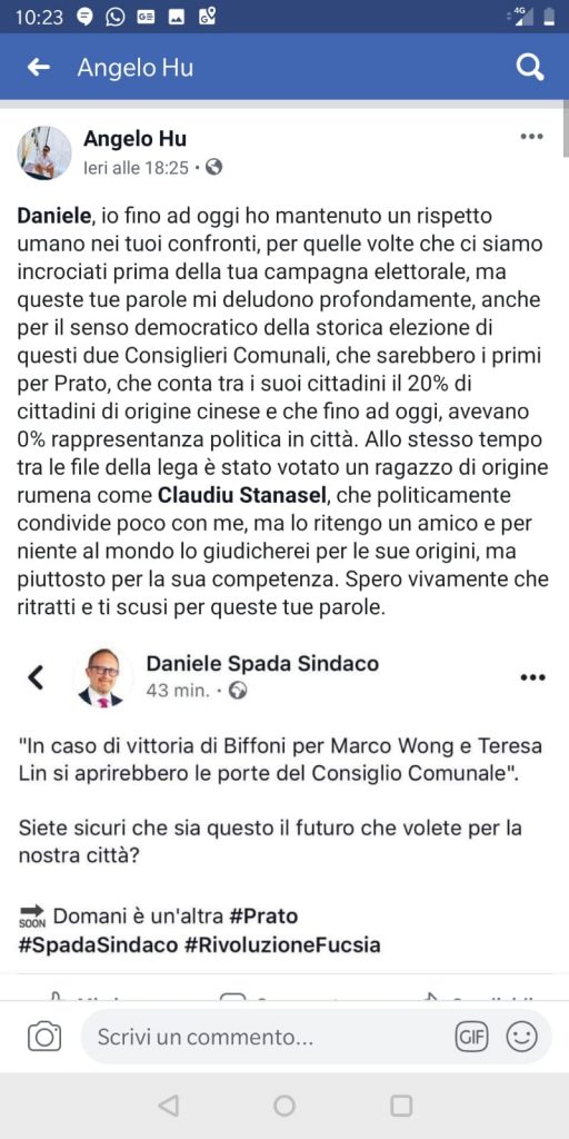 In molti su Facebook si sono domandati se fosse opportuno un intervento, da parte di un candidato a sindaco, che tira in causa direttamente l’origine di un consigliere. Tra le prime reazioni quella della presidente del consiglio comunale uscente Ilaria Santi: “Alcuni lo possono leggere come un post razzista. Di sicuro è un post che divide e questa città non ha bisogno di ulteriori divisioni. Non scordiamoci che Wong e Lin sono due consiglieri nati in Italia e con un curriculum di tutto rispetto. Per favore, possiamo tornare a parlare dei temi?”. Anche Angelo Hu, consigliere comunale a Campi Bisenzio di “SI Fare Città”, si dichiara “deluso” dalle parole di Spada e parla di “storica elezione” di Wong e Lin, “due consiglieri che sarebbero i primi a Prato – scrive su Facebook Hu – città che conta il 20% di cittadini cinesi e che fino ad oggi avevano 0% di rappresentanza politica”.